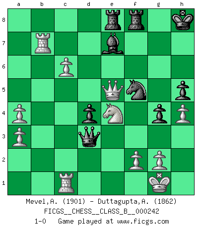 Last move : 1-0 2017 January 7 21:38:2 [Event "FICGS__CHESS__CLASS_B__000242"] [Site "FICGS"] [Date "2016.05.30"] [Round "1"] [White "Mevel,Alberic"] [Black "Duttagupta,Aniruddha"] [Result "1-0"] [WhiteElo "1901"] [BlackElo "1862"] 1.e4 c6 2.d4 d5 3.e5 Bf5 4.h4 h5 5.Bg5 Qb6 6.Bd3 Bxd3 7.Qxd3 e6 8.Nd2 c5 9.c4 Nc6 10.Ngf3 cxd4 11.O-O Nge7 12.Rfc1 a5 13.a3 a4 14.Rab1 Qa6 15.Nxd4 Nxd4 16.Qxd4 Nf5 17.Qf4 d4 18.c5 Qd3 19.b3 Be7 20.bxa4 O-O 21.Rxb7 f6 22.exf6 gxf6 23.Ne4 fxg5 24.Qe5 Rae8 25.Qxe6+ Kh8 26.c6 g4 27.Qe5+ 1-0 Caro-Kann : Advance variation Kingside Castling by player White (move 11) Kingside Castling by player Black (move 20) Player White won this chess game. Follow this game move after move (download)Nonsense was the last thing Fischer was interested in, as far as Chess was concerned. (Elie Agur) Schach ist wie eine schöne Frau, zu der wir ständig zurückkehren, gleichviel, wie oft sie uns zurückweist. (Anonymous) Bobby solo arroja las piezas y solas caen en las casillas correctas. (Miguel Najdorf ) 'L'échange des dames est un coup dur pour les deux adversaires...' Un journaliste lors d'une partie du match Spassky-Fischer Empty your mind, be formless, shapeless — like water. (Bruce Lee)