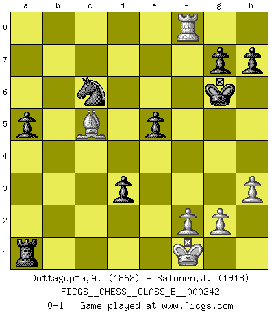 Last move : 0-1 2016 August 4 0:19:36 [Event "FICGS__CHESS__CLASS_B__000242"] [Site "FICGS"] [Date "2016.05.30"] [Round "1"] [White "Duttagupta,Aniruddha"] [Black "Salonen,Jukka"] [Result "0-1"] [WhiteElo "1862"] [BlackElo "1918"] 1.e4 e5 2.Nf3 Nc6 3.Bb5 a6 4.Ba4 Nf6 5.O-O Be7 6.d3 b5 7.Bb3 d6 8.a4 b4 9.Nbd2 O-O 10.a5 Be6 11.Nc4 Rb8 12.h3 Nd7 13.Be3 Qc8 14.c3 Qb7 15.d4 bxc3 16.d5 Qxb3 17.Qxb3 Rxb3 18.dxe6 fxe6 19.Rfc1 d5 20.Ncd2 cxd2 21.Rxc6 Bd6 22.Bxd2 Rxb2 23.Bc1 Re2 24.Kf1 Rxe4 25.Ng5 Nb8 26.Rxd6 cxd6 27.Nxe4 dxe4 28.Ba3 Rd8 29.Rc1 d5 30.Ke1 d4 31.Rc5 Kf7 32.Rxe5 Rd5 33.Rxe4 Nc6 34.Rf4+ Kg6 35.Bf8 Rxa5 36.Rf3 Ra1+ 37.Ke2 Ra2+ 38.Kf1 e5 39.Bd6 a5 40.Rf8 d3 41.Bc5 Ra1+ 0-1 Ruy Lopez : Closed defense Kingside Castling by player White (move 5) Kingside Castling by player Black (move 9) Player Black won this chess game. Follow this game move after move (download)After black's reply to 1.e4 with 1..e5, leaves him always trying to get into the game. (Howard Staunton) Der beste Spieler in einem Turnier gewinnt es nie. Er landet auf Platz zwei oder drei. (Siegbert Tarrasch) El Ajedrez, como cualquier actividad creativa, solo puede existir a través del esfuerzo combinado de aquellos que tienen talento creativo y de aquellos que poseen la habilidad de organizar su trabajo creativo. (Mikhail Botvinnik) Les échecs, c'est l'imagination. (David Bronstein) The leaves of memory seemed to make a mournful rustling in the dark. (Henry Wadsworth Longfellow)