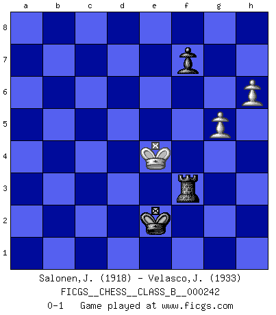 Last move : 0-1 2016 August 9 14:54:42 [Event "FICGS__CHESS__CLASS_B__000242"] [Site "FICGS"] [Date "2016.05.30"] [Round "1"] [White "Salonen,Jukka"] [Black "Velasco,Jose Maria"] [Result "0-1"] [WhiteElo "1918"] [BlackElo "1933"] 1.e4 c5 2.Nf3 d6 3.Bb5+ Nd7 4.d4 cxd4 5.Qxd4 a6 6.Bxd7+ Bxd7 7.c4 Nf6 8.O-O g6 9.Nc3 Bg7 10.Re1 O-O 11.Qd3 Rc8 12.Bg5 Bg4 13.Bxf6 Bxf6 14.Nd5 Bg7 15.Nd4 h5 16.h3 Bd7 17.Rad1 e6 18.Ne3 Qa5 19.b3 b5 20.Re2 Qb6 21.Nf3 Bc6 22.Nd4 Ba8 23.Red2 Rb8 24.cxb5 axb5 25.Rc2 Rfd8 26.Nf3 Qb7 27.Ng5 Bh6 28.h4 Bxg5 29.hxg5 Qxe4 30.Qxe4 Bxe4 31.Rcd2 d5 32.f3 Bf5 33.Kf2 Rbc8 34.a4 Rc3 35.Nxf5 gxf5 36.Rd3 Rc5 37.a5 b4 38.Ra1 Ra8 39.a6 Rc6 40.a7 Rc7 41.Rd4 R8xa7 42.Rxa7 Rxa7 43.Rxb4 Ra2+ 44.Kg3 e5 45.f4 e4 46.Rd4 Ra5 47.Rd2 Kg7 48.Kf2 h4 49.b4 Rb5 50.Ke3 Kg6 51.Rb2 Kh5 52.Rb3 Kg4 53.Rb1 d4+ 54.Kxd4 Kxf4 55.Kc4 Re5 56.b5 e3 57.b6 e2 58.b7 Re8 59.Kd3 h3 60.gxh3 Kf3 61.h4 Rb8 62.h5 Kf2 63.h6 e1Q 64.Rxe1 Kxe1 65.Ke3 Rxb7 66.Kf4 Rb3 67.Kxf5 Rf3+ 68.Ke4 Ke2 0-1 Sicilian : Canal-Sokolsky (Nimzovich-Rossolimo, Moscow) attack Kingside Castling by player White (move 8) Kingside Castling by player Black (move 10) 10 pieces endgame at move 60 : White KRPPP , Black KRPPP WHITE : King + 1 Rook 3 Pawns BLACK : King + 1 Rook 3 Pawns Promotion Queen by player Black (move 63) 9 pieces endgame at move 64 : White KRPPP , Black KRPP WHITE : King + 1 Rook 3 Pawns BLACK : King + 1 Rook 2 Pawns 8 pieces endgame at move 64 : White KPPP , Black KRPP WHITE : King + 3 Pawns BLACK : King + 1 Rook 2 Pawns 7 pieces endgame at move 65 : White KPP , Black KRPP WHITE : King + 2 Pawns BLACK : King + 1 Rook 2 Pawns 6 pieces endgame at move 67 : White KPP , Black KRP WHITE : King + 2 Pawns BLACK : King + 1 Rook 1 Pawn Player Black won this chess game. Follow this game move after move (download)Pawns are born free, yet they are everywhere in chains. (Rick Kennedy) Jeder Schachmeister war einmal ein Anfänger. (Irving Chernev) Nunca nadie ha ganado una partida de Ajedrez rindiendose. (Unknown) Aucun coup ne doit être joué sans but. (Pedro Damiano) A proverb is a short sentence based on long experience. (Miguel de Cervantes)