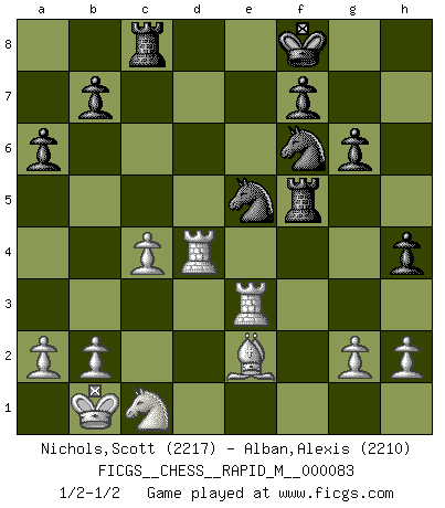 Last move : 1/2-1/2 2016 June 13 23:32:10 [Event "FICGS__CHESS__RAPID_M__000083"] [Site "FICGS"] [Date "2016.05.31"] [Round "1"] [White "Nichols,Scott"] [Black "Alban,Alexis"] [Result "1/2-1/2"] [WhiteElo "2217"] [BlackElo "2210"] 1.Nf3 c5 2.e4 d6 3.d4 cxd4 4.Nxd4 Nf6 5.Nc3 a6 6.f3 e5 7.Nb3 Be6 8.Be3 h5 9.Nd5 Bxd5 10.exd5 g6 11.Qd2 Nbd7 12.O-O-O Nb6 13.Kb1 Nfxd5 14.Bg5 Be7 15.Bxe7 Qxe7 16.c4 Nf6 17.Qxd6 Qxd6 18.Rxd6 Nbd7 19.Be2 Ke7 20.Rd3 Rac8 21.Rhd1 h4 22.Nc1 Rh5 23.f4 Rf5 24.fxe5 Nxe5 25.Re3 Kf8 26.Rd4 1/2-1/2 Reti Opening Queenside Castling by player White (move 12) This chess game ended in a draw. Follow this game move after move (download)Chess opens and enriches your mind. (Saudin Robovic) Spielt Blackmar-Diemer-Gambit, und das Matt kommt von selbst! (Emil Joseph Diemer) Yo considero que Fischer es uno de los expertos mas grandes de aperturas de siempre. (Keith Hayward) Demandez au pauvre Cg1 ce qu'il en pense. Eduard Gufeld à propos de la variante Saemisch de l'Est-Indienne. Life is painting a picture, not doing a sum. (Oliver Wendell Holmes, Jr.)