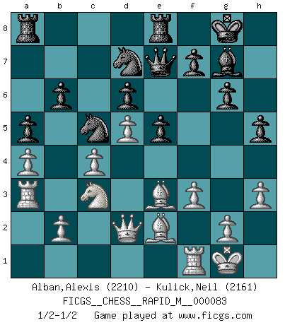 Last move : 1/2-1/2 2016 July 11 20:50:20 [Event "FICGS__CHESS__RAPID_M__000083"] [Site "FICGS"] [Date "2016.05.31"] [Round "1"] [White "Alban,Alexis"] [Black "Kulick,Neil"] [Result "1/2-1/2"] [WhiteElo "2210"] [BlackElo "2161"] 1.e4 c5 2.Nf3 d6 3.d4 cxd4 4.Nxd4 Nf6 5.Nc3 a6 6.f3 e5 7.Nb3 Be6 8.Be3 h5 9.Be2 Nbd7 10.Nd5 Bxd5 11.exd5 g6 12.Qd2 Bg7 13.O-O b6 14.h3 O-O 15.c3 Re8 16.a4 Qc7 17.Ra3 Qb7 18.c4 a5 19.Nc1 Nc5 20.Na2 Qe7 21.Nc3 Nfd7 1/2-1/2 Sicilian : Najdorf Kingside Castling by player White (move 13) Kingside Castling by player Black (move 14) This chess game ended in a draw. Follow this game move after move (download)Blessed be the memory of him who gave the world this immortal game. (A. G. Gardiner) Ich bin Weltmeister und muß mit niemandem irgend etwas diskutieren. (Viswanathan Anand) Por la belleza de sus partidas, la claridad de su juego y lo brillante de sus ideas, Fischer se creó el mismo como un artista de la misma estatura como Brahms, Rembrandt y Shakespeare. (David Levy) Il a essayé de se convaincre qu'il pourrait empêcher toutes les erreurs et ne jamais perdre. L'horreur ! Gary Kasparov au sujet de Robert Fischer. The problem with manipulation is that people can turn on you. (Horatio Caine, C.S.I. Miami)
