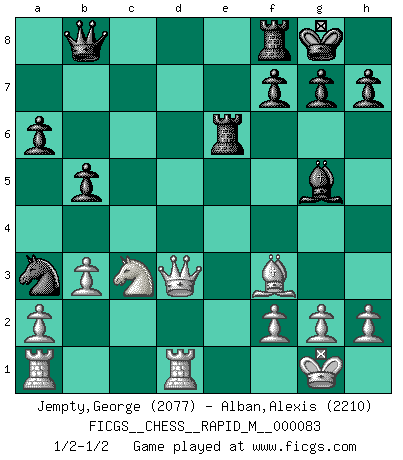 Last move : 1/2-1/2 2016 July 17 12:26:16 [Event "FICGS__CHESS__RAPID_M__000083"] [Site "FICGS"] [Date "2016.05.31"] [Round "1"] [White "Jempty,George"] [Black "Alban,Alexis"] [Result "1/2-1/2"] [WhiteElo "2077"] [BlackElo "2210"] 1.e4 c5 2.c3 Nf6 3.e5 Nd5 4.d4 cxd4 5.Nf3 Nc6 6.cxd4 d6 7.Bc4 Nb6 8.Bb5 dxe5 9.Nxe5 Bd7 10.Nxd7 Qxd7 11.Nc3 e6 12.O-O Rd8 13.Be3 Be7 14.Qb3 O-O 15.Rfd1 Qc8 16.Rac1 Na5 17.Qc2 Nac4 18.Qe2 Nxe3 19.Qxe3 a6 20.Be2 Qb8 21.Bf3 Nc4 22.Qe2 b5 23.b3 Na3 24.d5 Bg5 25.Ra1 Rde8 26.dxe6 Rxe6 27.Qd3 Bf6 28.Rac1 Bg5 29.Ra1 1/2-1/2 Sicilian : Alapin's variation (2.c3) Kingside Castling by player White (move 12) Kingside Castling by player Black (move 14) This chess game ended in a draw. Follow this game move after move (download)Fischer Chess play was always razor-sharp, rational and brilliant. One of the best ever. (Dave Regis) In der Schule lernt man nichts. Es ist nur Zeitverschwendung. (Robert James Fischer) Existen dos clases de sacrificios: los correctos y los míos. (Mikhail Tal) Toutes les manuvres exécutées sur une colonne ouverte ont pour but ultime l'intrusion définitive sur la septième ou la huitième rangée, en plein cur de la position ennemie. (Aaron Nimzovitch) The next best thing to gambling and winning is gambling and loosing. (Nick Dandalos)