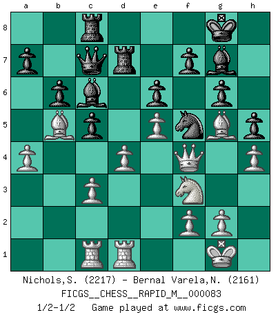 Last move : 1/2-1/2 2016 June 16 4:13:10 [Event "FICGS__CHESS__RAPID_M__000083"] [Site "FICGS"] [Date "2016.05.31"] [Round "1"] [White "Nichols,Scott"] [Black "Bernal Varela,Nelson"] [Result "1/2-1/2"] [WhiteElo "2217"] [BlackElo "2161"] 1.Nf3 Nf6 2.d4 e6 3.c4 b6 4.a3 Bb7 5.Nc3 d5 6.cxd5 Nxd5 7.Qc2 Nxc3 8.bxc3 Be7 9.e4 O-O 10.Bd3 c5 11.O-O Qc7 12.Qa2 Rd8 13.Rd1 h6 14.h3 Bf6 15.e5 Be7 16.Qe2 Nc6 17.Qe4 g6 18.Qf4 Bf8 19.h4 Bg7 20.Be3 Ne7 21.Qg3 h5 22.Bg5 Rac8 23.a4 Rd7 24.Bb5 Nf5 25.Qf4 Bc6 26.Rac1 1/2-1/2 Reti Opening Kingside Castling by player Black (move 9) Kingside Castling by player White (move 11) This chess game ended in a draw. Follow this game move after move (download)All my games are real. (Bobby Fischer) Die Leute spielen gegen mich seit 15 Jahren unter Ihren Möglichkeiten. (Robert James Fischer) Si no le temes a Spassky, entonces elimino el elemento del dinero. (Jim Slater) On entre au jeu d'Echecs comme on entre en Religion. Pour le joueur d'Echecs, la partie d'Echecs c'est l'office, la messe, le défilé du 1er Mai, le dépôt de gerbe au Monument aux Morts. C'est un drame sacré. (Michel Roos) The existence of forgetting has never been proved: We only know that some things don't come to mind when we want them. (Friedrich Nietzsche)