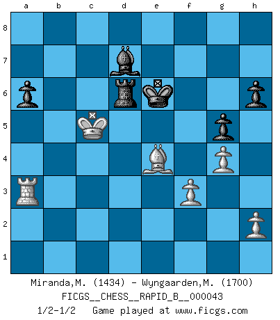 Last move : 1/2-1/2 2007 May 11 19:40:31 [Event "FICGS__CHESS__RAPID_B__000043"] [Site "FICGS"] [Date "2007.03.25"] [Round "1"] [White "Miranda,Marcus"] [Black "Wyngaarden,Martin"] [Result "1/2-1/2"] [WhiteElo "1434"] [BlackElo "1700"] 1.d4 Nf6 2.c4 e6 3.Nf3 b6 4.g3 Ba6 5.b3 Bb4+ 6.Bd2 Be7 7.Bg2 c6 8.Bc3 d5 9.Ne5 Nfd7 10.Nxd7 Nxd7 11.Nd2 O-O 12.O-O Rc8 13.e4 b5 14.Re1 dxc4 15.bxc4 bxc4 16.Qa4 Bb5 17.Qc2 Re8 18.Red1 Qc7 19.a4 Ba6 20.Qa2 c5 21.d5 exd5 22.exd5 Ne5 23.Rab1 Rb8 24.Rxb8 Rxb8 25.Qa1 Bd6 26.Ne4 f6 27.Nxd6 Qxd6 28.Re1 Bc8 29.Bxe5 fxe5 30.Bf1 Bf5 31.Bxc4 Rb4 32.Qxe5 Qxe5 33.Rxe5 Bh3 34.Bd3 Rxa4 35.f3 c4 36.Be4 Ra2 37.Rh5 Bd7 38.d6 Kf7 39.Bd5+ Kg6 40.g4 Ra3 41.Kf2 c3 42.Ke3 h6 43.Kd3 Ra6 44.Be4+ Kf6 45.Rd5 Ke6 46.Kxc3 Rc6+ 47.Kb4 Rxd6 48.Ra5 a6 49.Kc5 g5 50.Ra3 1/2-1/2 Queen's Indian : Nimzovich variation (exaggerated Fianchetto) Kingside Castling by player Black (move 11) Kingside Castling by player White (move 12) This chess game ended in a draw. Follow this game move after move (download)Personally, I rather look forward to a computer program winning the world Chess Championship. Humanity needs a lesson in humility. (Richard Dawkings) Ich habe Putins Aufstieg an die Macht beobachtet und seine Politik, die demokratischen Institutionen meines Landes zu zerstören. (Garry Kasparov) Alguna parte de un error es siempre correcto. (Savielly Tartakover) Lorsque vous vous retrouvez devant une position atroce, ne tendez pas un ultime piège dérisoire avec l'intention d'abandonner si l'adversaire le déjoue ! Faites-vous plutôt un devoir de résister comme si votre vie en dépendait. Jouez le coup qui vous déplairait au centuple si vous étiez dans la peau de votre tortionnaire ! We cannot be sure of having something to live for unless we are willing to die for it. (Ernesto Che Guevara)