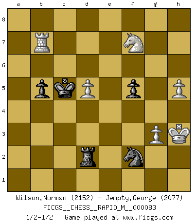 Last move : 1/2-1/2 2016 August 29 7:56:18 [Event "FICGS__CHESS__RAPID_M__000083"] [Site "FICGS"] [Date "2016.05.31"] [Round "1"] [White "Wilson,Norman"] [Black "Jempty,George"] [Result "1/2-1/2"] [WhiteElo "2152"] [BlackElo "2077"] 1.g3 e5 2.c4 c6 3.d4 Bb4+ 4.Bd2 Bxd2+ 5.Qxd2 d6 6.Nc3 Nf6 7.Bg2 O-O 8.e4 a6 9.Nf3 Bg4 10.O-O Nbd7 11.Ne1 b5 12.h3 Bh5 13.Nc2 Nb6 14.b3 bxc4 15.Ne3 cxb3 16.axb3 Bg6 17.Rfd1 Qe7 18.dxe5 dxe5 19.Qd6 Nfd5 20.Qxe7 Nxe7 21.b4 f6 22.Bf1 Ra7 23.Bxa6 Rfa8 24.Bc4+ Nxc4 25.Rxa7 Rxa7 26.Rd8+ Kf7 27.Nxc4 Ra1+ 28.Kh2 Ng8 29.b5 cxb5 30.Nd6+ Ke7 31.Nb7 Bf7 32.Nd5+ Bxd5 33.exd5 Kf7 34.Rd7+ Kg6 35.Nd8 f5 36.Ne6 Nf6 37.Rxg7+ Kh6 38.Rf7 Kg6 39.Rb7 Ra2 40.Nf8+ Kh5 41.Kg2 Ne4 42.Rxh7+ Kg5 43.h4+ Kf6 44.Rb7 Rxf2+ 45.Kh3 Rd2 46.Nd7+ Ke7 47.Nxe5 Kd6 48.Nf7+ Kc5 49.h5 Nf2+ 1/2-1/2 Benko's Opening Kingside Castling by player Black (move 7) Kingside Castling by player White (move 10) This chess game ended in a draw. Follow this game move after move (download)Could we look into the head of a Chess player, we should see there a whole world of feelings, images, ideas, emotion and passion. (Alfred Binet) Ein Großmeister muß tausende Partien in seinem Kopf speichern, denn diese sind für Ihn, was die Worte der Muttersprache für gewöhnliche Leute sind, oder Noten für Musiker... (Garry Kasparov) Si el Ajedrez es una ciencia, es la mas inexacta. Si el Ajedrez es un arte, es demasiado inexacto para ser visto como tal. Si el Ajedrez es un deporte, es demasiado esotérico. Si el Ajedrez es un juego, es demasiado exigente para ser solo un juego. Si el Ajedrez es una aventura, es una muy demandante. Si el Ajedrez es una pasión, es una muy gratificante. Si el Ajedrez es la vida, es una muy triste. (Anónimo) Karpov est une pièce de musée. (Garry Kasparov) A good book on your shelf is a friend that turns its back on you and remains a friend. (Author unknown)