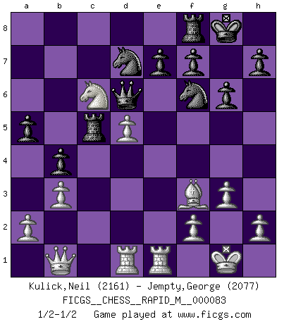 Last move : 1/2-1/2 2016 June 26 21:16:36 [Event "FICGS__CHESS__RAPID_M__000083"] [Site "FICGS"] [Date "2016.05.31"] [Round "1"] [White "Kulick,Neil"] [Black "Jempty,George"] [Result "1/2-1/2"] [WhiteElo "2161"] [BlackElo "2077"] 1.Nf3 Nf6 2.d4 g6 3.c4 Bg7 4.Nc3 d5 5.Qb3 dxc4 6.Qxc4 O-O 7.e4 a6 8.Be2 b5 9.Qb3 c5 10.dxc5 Be6 11.Qc2 Nbd7 12.Be3 Rc8 13.Rd1 b4 14.Nd5 Bxd5 15.exd5 Nxc5 16.O-O a5 17.Rfe1 Ncd7 18.Qb1 Qc7 19.g3 Ng4 20.Bd4 Qd6 21.b3 Bxd4 22.Nxd4 Ngf6 23.Bf3 Rc5 24.Nc6 1/2-1/2 Reti Opening Kingside Castling by player Black (move 6) Kingside Castling by player White (move 16) This chess game ended in a draw. Follow this game move after move (download)Live, lose, and learn, by observing your opponent how to win. (Amber Steenbock) Ich brauche nur einen Blick auf das Schachbrett zu werfen, und weiß schon, was in der Stellung steckt, was geschehen kann und was geschehen wird. Alle übrigen suchen und prüfen, ich aber weiß es! (José Raúl Capablanca) Mis oponentes también hacen buenas movidas. A veces yo no tomo esas cosas en consideración. (Bobby Fischer) Le jeu d'échecs est comme rejeté hors du temps. (Antoine de Saint-Exupéry) When you've done things right people won't know you've done anything at all. (Futurama)