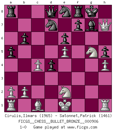 Last move : 1-0 2016 May 31 16:59:22 [Event "FICGS__CHESS__BULLET_BRONZE__000906"] [Site "FICGS"] [Date "2016.05.31"] [Round "1"] [White "Cirulis,Ilmars"] [Black "Satonnet,Patrick"] [Result "1-0"] [WhiteElo "1965"] [BlackElo "1461"] 1.h4 h5 2.d4 g6 3.e3 Bg7 4.c4 Nf6 5.f4 d6 6.Nc3 Bg4 7.Qb3 O-O 8.Nf3 Nbd7 9.e4 b6 10.Be2 a5 11.e5 dxe5 12.fxe5 Ne8 13.Ng5 Bxe2 14.Nxe2 e6 15.g4 c5 16.gxh5 gxh5 17.Qc2 cxd4 18.Qh7+ 1-0 Anti-Borg (Desprez) Opening Kingside Castling by player Black (move 7) Player White won this chess game. Follow this game move after move (download)All Chess players should have a hobby. (Savielly Tartakower) Wenn Du einsam bist, wenn Du Dich in der Welt wie ein Fremder fühlst, spiele Schach. Das wird Deinen Geist erheben und Dein Ratgeber im Kampf sein. (Aristoteles) La pasion por jugar al Ajedrez es una de las mas inexplicables en el mundo. (H.G. Wells) La conception d'un plan est le processus par lequel un joueur exploite les avantages de sa position tout en s'efforçant d'en réduire au minimum les inconvénients. Afin de garantir le succès, un plan doit toujours se fonder sur un diagnostic objectif des particularités d'une position. La conception d'un plan est d'autant plus difficile que la position est équilibrée, et grandement facilitée lorsqu'il n'existe qu'un seul plan susceptible de répondre aux exigences de la position. (Harry Golombek) Hello Thibault, if I have had a plan (and I had one, I hope), I have forgotten it during the last week... - Hello Heinz-Georg. What do you mean a plan ? (Anonymous players, during a Big Chess game)