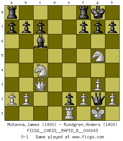 Last move : 0-1 2007 March 27 13:4:28 [Event "FICGS__CHESS__RAPID_B__000043"] [Site "FICGS"] [Date "2007.03.25"] [Round "1"] [White "McKenna,James"] [Black "Rundgren,Anders"] [Result "0-1"] [WhiteElo "1400"] [BlackElo "1400"] 1.d4 d5 2.c4 dxc4 3.e4 e5 4.Nf3 exd4 5.Bxc4 Nc6 6.Bb5 Bb4+ 7.Bd2 Bd7 8.Bxc6 Bxd2+ 9.Nbxd2 Bxc6 10.O-O Ne7 11.Re1 O-O 12.Qc2 Ng6 13.Rad1 d3 14.Qc3 Nf4 15.Nc4 Qe7 16.g3 Ne2+ 17.Rxe2 dxe2 18.Re1 Qxe4 19.Ng5 Qg2+ 0-1 QGA : 3.e4 Kingside Castling by player White (move 10) Kingside Castling by player Black (move 11) Player Black won this chess game. Follow this game move after move (download)It began to feel as though you were playing against Chess itself. - On playing against Robert Fischer. (Walter Shipman) Ich habe die Schachforschung dermaßen betrieben, dass sie auf eine wissenschaftliche Basis gestellt wurde. (Mikhail Moiseyevich Botvinik) ¿Cual es el objetivo de jugar una apertura de gambito?... Para adquirir una reputación de ser un jugador apuesto a costo de perder el juego. (Siegbert Tarrasch) L'ordinateur a tué l'originalité. Il n'y a plus guère d'aventures sur l'échiquier. (Jacob Murray) When you stop learning you start dying. (Scott Adams)