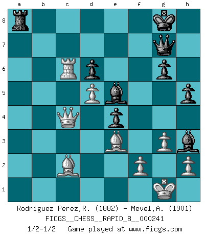 Last move : 1/2-1/2 2016 September 14 16:53:47 [Event "FICGS__CHESS__RAPID_B__000241"] [Site "FICGS"] [Date "2016.06.03"] [Round "1"] [White "Rodriguez Perez,Rene"] [Black "Mevel,Alberic"] [Result "1/2-1/2"] [WhiteElo "1882"] [BlackElo "1901"] 1.e4 c5 2.Nf3 Nc6 3.d4 cxd4 4.Nxd4 e5 5.Nb5 d6 6.N1c3 a6 7.Na3 b5 8.Nd5 Nge7 9.c4 Nxd5 10.cxd5 Nd4 11.Be3 g6 12.Nc2 Nxc2+ 13.Qxc2 f5 14.exf5 Bxf5 15.Bd3 Rc8 16.Qd2 Qd7 17.O-O Bg7 18.a4 bxa4 19.Bxa6 Ra8 20.Be2 O-O 21.Rfc1 Rfb8 22.Rc6 e4 23.Ra2 Be5 24.Bd1 Qg7 25.Rxa4 Rxa4 26.Bxa4 Rxb2 27.Bc2 Rb8 28.g3 h5 29.Qe2 Ra8 30.Qc4 Bh3 1/2-1/2 Sicilian : Labourdonnais-Loewenthal (Kalashnikov) variation Kingside Castling by player White (move 17) Kingside Castling by player Black (move 20) This chess game ended in a draw. Follow this game move after move (download)I give 98 percent of my mental energy to Chess. Others give only 2 percent. (Bobby Fischer) Wenn ich gewinne bin ich ein Genie. Wenn nicht, dann bin ich keines. (Robert James Fischer) Hoy en día, si tu no eres un Gran Maestro a los 14 años, es mejor que lo olvides. (Anand Viswanathan) La conception d'un plan est le processus par lequel un joueur exploite les avantages de sa position tout en s'efforçant d'en réduire au minimum les inconvénients. Afin de garantir le succès, un plan doit toujours se fonder sur un diagnostic objectif des particularités d'une position. La conception d'un plan est d'autant plus difficile que la position est équilibrée, et grandement facilitée lorsqu'il n'existe qu'un seul plan susceptible de répondre aux exigences de la position. (Harry Golombek) The absolute truth is the thing that makes people laugh. (Carl Reiner)