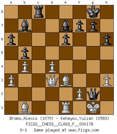 Last move : 0-1 2016 September 13 8:19:19 [Event "FICGS__CHESS__CLASS_F__000178"] [Site "FICGS"] [Date "2016.06.07"] [Round "1"] [White "Bromo,Alexis"] [Black "Kehayov,Yulian"] [Result "0-1"] [WhiteElo "1079"] [BlackElo "0983"] 1.d4 d5 2.c4 dxc4 3.Nc3 e6 4.a3 c5 5.e3 Nf6 6.Bxc4 Be7 7.Nf3 O-O 8.h3 cxd4 9.Nxd4 Nc6 10.O-O Nxd4 11.exd4 a6 12.Re1 b5 13.Bb3 Bb7 14.Be3 Re8 15.Ba2 Qd7 16.b4 h6 17.Rc1 Rac8 18.Bb1 Nd5 19.Nxd5 Qxd5 20.Rxc8 Rxc8 21.Qd3 Qxg2+ 0-1 Queen's gambit accepted Kingside Castling by player Black (move 7) Kingside Castling by player White (move 10) Player Black won this chess game. Follow this game move after move (download)It is no time to be playing Chess when the house is on fire. (Italian Proverb) Moralische Siege zählen nicht. (Savielly Grigorievitsch Tartakower) El Ajedrez no es una pizca de inferior al violín, y tenemos un gran número de violinistas profesionales. (Mikhail Botvinnik) Ce qui caractérise les parties de combat, c'est que si le défenseur a constamment de difficiles problèmes à résoudre, l'attaquant doit chercher sans relâche de nouvelles possibilités d'attaque. (Koblentz) Employ the attack like tactic of defense. (Chinese proverb)