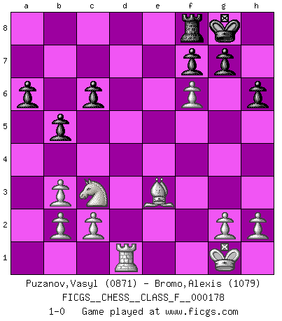 Last move : 1-0 2016 October 11 20:29:39 [Event "FICGS__CHESS__CLASS_F__000178"] [Site "FICGS"] [Date "2016.06.07"] [Round "1"] [White "Puzanov,Vasyl"] [Black "Bromo,Alexis"] [Result "1-0"] [WhiteElo "0871"] [BlackElo "1079"] 1.e4 e5 2.f4 d6 3.Nf3 Nf6 4.Nc3 Nc6 5.Bb5 Bd7 6.d3 a6 7.Bc4 h6 8.O-O b5 9.Bb3 Na5 10.fxe5 dxe5 11.Be3 Nxb3 12.axb3 c6 13.Nxe5 Bd6 14.Nxd7 Qxd7 15.d4 O-O 16.e5 Bxe5 17.dxe5 Qxd1 18.Rfxd1 Rad8 19.exf6 Rxd1+ 20.Rxd1 1-0 King's gambit Kingside Castling by player White (move 8) Kingside Castling by player Black (move 15) Player White won this chess game. Follow this game move after move (download)I know people who have all the will in the world, but still can't play good Chess. (Bobby Fischer) Ich habe die besten Aussichten, den ersten Preis zu gewinnen - denn jeder muss gegen Steinitz spielen, nur ich nicht! (Wilhelm Steinitz) En la perfecta combinación de Ajedrez como en una historia corta de primera clase, toda la trama y contra trama deberá conducir hacia un final sorprendente, el interes no es mitigado hasta el último momento. (Yates and Winter) Les Cavaliers se révèlent fort utiles dans les positions fermées. D'habitude, les Fous sont un peu plus forts que les Cavaliers dans les positions ouvertes. Qu'on le veuille ou non, il restera toujours des exceptions ! Knowledge rests not upon truth alone, but upon error also. (Carl G. Jung)