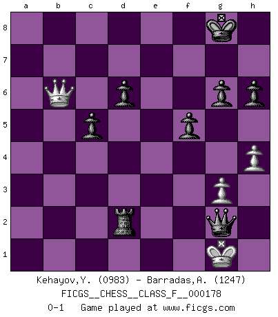 Last move : 0-1 2016 July 30 0:12:4 [Event "FICGS__CHESS__CLASS_F__000178"] [Site "FICGS"] [Date "2016.06.07"] [Round "1"] [White "Kehayov,Yulian"] [Black "Barradas,Anderson"] [Result "0-1"] [WhiteElo "0983"] [BlackElo "1247"] 1.g3 g6 2.Bg2 Bg7 3.Nf3 Nf6 4.O-O O-O 5.d4 d6 6.c4 b6 7.Nc3 Bb7 8.Qd3 Nbd7 9.e4 e5 10.d5 Nc5 11.Qc2 Ba6 12.Qe2 Bc8 13.b4 Na6 14.a3 Bd7 15.Na2 Nb8 16.b5 a6 17.a4 axb5 18.cxb5 Rxa4 19.Bb2 Rxe4 20.Qd2 Bxb5 21.Rfe1 Rxe1+ 22.Rxe1 Nbd7 23.Nc3 Ba6 24.Ne4 Nxe4 25.Rxe4 Nc5 26.Re1 Nb3 27.Qb4 Nc5 28.Ba3 Nd3 29.Qa4 Nxe1 30.Nxe1 Bb7 31.Qc2 Re8 32.Bb2 Re7 33.Be4 f5 34.Bg2 e4 35.Qd2 Bxb2 36.Qxb2 Bxd5 37.f3 exf3 38.Bxf3 Bxf3 39.Nxf3 Qe8 40.Kf2 h6 41.h4 Re4 42.Nd4 c5 43.Qb5 Rxd4 44.Qxb6 Rd2+ 45.Kf1 Qe2+ 46.Kg1 Qg2+ 0-1 Benko's Opening Kingside Castling by player White (move 4) Kingside Castling by player Black (move 4) Player Black won this chess game. Follow this game move after move (download)In the perfect Chess combination as in a first-rate short story, the whole plot and counter-plot should lead up to a striking finale, the interest not being allayed until the very last moment. (Yates and Winter) Ich hatte meine größten Erfolge, als ich 47 Jahre alt war. Kasparow war noch nicht mal 42 und hat das Schach schon im Stich gelassen. (Viktor Kortschnoi) Cuando no sepas que mover, espera por una idea que se le venga a la la cabeza de tu oponente. Tenlo por seguro de que esa idea estará incorrecta. (Siegbert Tarrasch) Nous vivons dans un monde échiquéen : chaque jour qui passe est un défi à relever. (Philosophe Sasha) I find your interest interesting. (Gregory House, House M.D.)