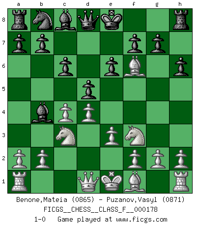 Last move : 1-0 2016 July 27 22:55:22 [Event "FICGS__CHESS__CLASS_F__000178"] [Site "FICGS"] [Date "2016.06.07"] [Round "1"] [White "Benone,Mateia"] [Black "Puzanov,Vasyl"] [Result "1-0"] [WhiteElo "0865"] [BlackElo "0871"] 1.Nf3 d5 2.d4 Nf6 3.c4 e6 4.Bg5 Bb4+ 5.Nc3 c6 6.e3 h6 7.Bxf6 1-0 This chess game has been lost on time (started : 2016.06.07 4:39:37) Reti Opening Player White won this chess game. Follow this game move after move (download)Those who say they understand Chess, understand nothing. (Robert Hubner) Schach ist ein Kampf gegen den Fehler. (Johannes Herrman Zukertort) Un juego de Ajedrez es un dialogo, una conversación entre un jugador y su oponente. Cada movimiento del oponente puede contener amenazas o tropiezos, pero un jugador no se puede defender de las amenazas o tomar ventaja de los tropiezos si es que no se pregunta a sí mismo: ¿Que es lo que mi oponente va a hacer después de cada movida?. (Bruce A. Moon) Les réformistes prétendent que les progrès de la théorie conduiront à la disparition des échecs, et qu'il faut, pour leur rendre vie, en remanier les règles. En réalité, qu'exprime cette affirmation? Le mépris de l'intuition, de l'imagination et de tous les autres éléments qui font des échecs un art. (Alexander Alekhine) Patience, use the Force, think ! (Obi-Wan Kenobi in Star Wars ep.2)