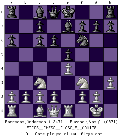 Last move : 1-0 2016 July 17 21:39:26 [Event "FICGS__CHESS__CLASS_F__000178"] [Site "FICGS"] [Date "2016.06.07"] [Round "1"] [White "Barradas,Anderson"] [Black "Puzanov,Vasyl"] [Result "1-0"] [WhiteElo "1247"] [BlackElo "0871"] 1.e4 e5 2.Nf3 Nc6 3.Bb5 a6 4.Bxc6 bxc6 5.Nc3 d6 6.h3 Nf6 7.O-O Be7 8.Re1 1-0 This chess game has been lost on time (started : 2016.06.07 4:39:37) Ruy Lopez : Exchange variation Kingside Castling by player White (move 7) Player White won this chess game. Follow this game move after move (download)There is only one thing Fischer does in Chess without pleasure: to lose ! (Boris Spassky) Jeder weiß, dass Gasprom Putins persönliches Machtinstrument ist. Die Firma wird vom Kreml aus geleitet und wird schon deshalb nie transparent sein. (Garry Kasparov) Si pudieramos observar el interior de la cabeza de un jugador de Ajedrez, encontraríamos ahí un mundo lleno de sentimientos, imágenes, ideas, emoción y pasión. (Alfred Binet) Le thème de l'attaque double intervient d'une manière ou d'une autre dans l'immense majorité des combinaisons. (Youri Averbakh) Quotation,n.: The act of repeating erroneously the words of another. The words erroneously repeated. (Ambrose Bierce, The Devil's Dictionary)