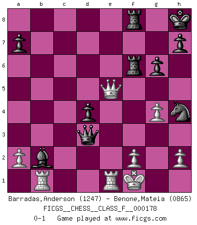 Last move : 0-1 2016 June 14 3:11:38 [Event "FICGS__CHESS__CLASS_F__000178"] [Site "FICGS"] [Date "2016.06.07"] [Round "1"] [White "Barradas,Anderson"] [Black "Benone,Mateia"] [Result "0-1"] [WhiteElo "1247"] [BlackElo "0865"] 1.e4 c5 2.Nf3 g6 3.d4 cxd4 4.Nxd4 Bg7 5.Bc4 Nc6 6.Nxc6 bxc6 7.Nc3 e6 8.O-O d5 9.exd5 cxd5 10.Bb5+ Bd7 11.Qd3 Ne7 12.Re1 O-O 13.Bxd7 Qxd7 14.Ne4 Qc6 15.Nc3 Rac8 16.Bd2 Nf5 17.Rac1 Nd6 18.Ne2 Bxb2 19.Nd4 Qc4 20.Qg3 Qxd4 21.Be3 Qb4 22.Rb1 Nf5 23.c3 Qxc3 24.Qf4 e5 25.Qf3 d4 26.Bg5 f6 27.Qd5+ Kh8 28.Bxf6+ Rxf6 29.Qxe5 Rcf8 30.g4 Nh4 31.Kf1 Qd3+ 0-1 Sicilian : Hungarian variation Kingside Castling by player White (move 8) Kingside Castling by player Black (move 12) Player Black won this chess game. Follow this game move after move (download)Half the variations which are calculated in a tournament game turn out to be completely superfluous. Unfortunately, no one knows in advance which half. (Jan Tinman) Ein Schachgenie ist jemand der verdammt gut Schach spielt. (Jonathan Levitt) Siempre es mejor sacrificar los hombres de tu oponente. (Savielly Tartakower) Les échecs sont un jeu par leur forme, un art par leur essence et une science par sa difficulté d'acquisition. Ils peuvent vous procurer autant de plaisir qu'un bon livre ou une belle musique, mais vous n'aurez une réelle joie que si vous arrivez à bien jouer. (Tigran Petrosian) Wisdom doesn't necessarily come with age. Sometimes age just shows up all by itself. (Tom Wilson)