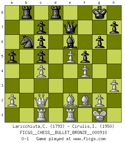Last move : 0-1 2016 June 9 16:12:52 [Event "FICGS__CHESS__BULLET_BRONZE__000910"] [Site "FICGS"] [Date "2016.06.09"] [Round "1"] [White "Laricchiuta,Claudio"] [Black "Cirulis,Ilmars"] [Result "0-1"] [WhiteElo "1793"] [BlackElo "1950"] 1.c4 a6 2.Nc3 e5 3.Nf3 Nc6 4.d4 exd4 5.Nxd4 Nf6 6.Nxc6 bxc6 7.Bf4 Bb4 8.e3 Bxc3+ 9.bxc3 O-O 10.Bd3 d6 11.c5 dxc5 12.O-O Nd5 13.Bg3 Qe7 14.Qc2 g6 15.h3 a5 16.e4 Nb6 17.c4 Rd8 18.f4 f5 19.Rfe1 Qf6 20.e5 Qf7 21.Bf2 Be6 22.Rac1 Qe7 23.Qc3 Rab8 24.Be2 Na4 25.Qc2 Nb6 0-1 English Opening Kingside Castling by player Black (move 9) Kingside Castling by player White (move 12) Player Black won this chess game. Follow this game move after move (download)The passed Pawn is a criminal, who should be kept under lock and key. Mild measures, such as police surveillance, are not sufficient. (Aaron Nimzovich) Der vorletzte Fehler gewinnt. (Savielly Grigorievitsch Tartakower) Debemos de asegurarnos de que el Ajedrez no se convierta en un lenguaje muerto, muy interesante, pero solo para un grupo muy pequeño. (Sytze Faber) Le joueur d'Echecs qui veut atteindre le top est obligé de développer son propre credo créatif. Alexeï Stepanovicth Souétine. Il est facile d'écrire des livres ! Ce qui est difficile, c'est de jouer ! (Alexeï Stepanovicth Souétine) Knowledge will give you power, but character respect. (Bruce Lee)