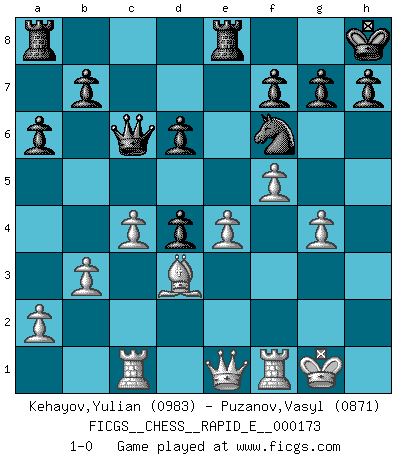 Last move : 1-0 2016 September 12 22:18:37 [Event "FICGS__CHESS__RAPID_E__000173"] [Site "FICGS"] [Date "2016.06.10"] [Round "1"] [White "Kehayov,Yulian"] [Black "Puzanov,Vasyl"] [Result "1-0"] [WhiteElo "0983"] [BlackElo "0871"] 1.e4 e5 2.Nf3 Nc6 3.d4 exd4 4.Nxd4 Bc5 5.Nf3 d6 6.Be2 Nf6 7.Bd3 Be6 8.O-O O-O 9.c4 Re8 10.Nc3 Nd4 11.Nxd4 Bxd4 12.Bd2 Qd7 13.Qe2 a6 14.b3 c5 15.Be3 Bxc3 16.Rac1 Bd4 17.Bxd4 cxd4 18.f4 Bg4 19.Qe1 Kh8 20.f5 Qc6 21.h3 Bh5 22.g4 Bxg4 23.hxg4 1-0 This chess game has been lost on time (started : 2016.06.10 23:19:51) Scotch game Kingside Castling by player White (move 8) Kingside Castling by player Black (move 8) Player White won this chess game. Follow this game move after move (download)Look at Garry Kasparov. After he loses, invariably he wins the next game. He just kills the next guy. That's something that we have to learn to be able to do. (Maurice Ashley) Kein Großmeister ist normal. Sie unterscheiden sich nur im Ausmaß Ihrer Verrücktheit. (Viktor Kortschnoi) Tu sabes que vas a perder. Aún cuando tenía la ventaja, yo sabía que iba a perder. - al estar jugando con Fischer (Andrew Soltis) Il n'y a pas eu de défaite parce que je ne crois pas que cet ordinateur ait jamais existé. IBM a triché en refusant d'imprimer les modes de recherche de la machine. C'est évident, pendant le match, des coups décisifs ont été joués par des êtres humains. Aujourd'hui, les meilleurs spécialistes en informatique ne peuvent toujours pas expliquer comment Deep-Blue a pu jouer contre la logique des ordinateurs. IBM a gagné une guerre de communication, mais ils sont incapables de prouver que l'ordinateur a gagné tout seul. (Garry Kasparov) The smarter you play, the luckier you'll be. (Mark Pilarski)