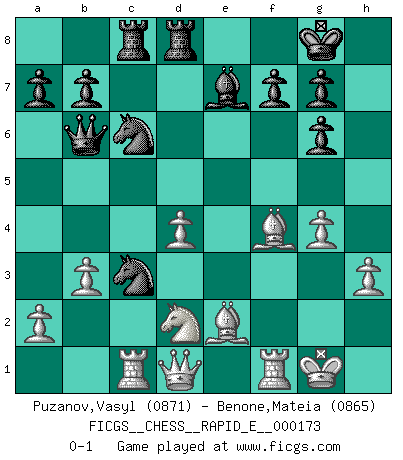 Last move : 0-1 2016 September 12 22:18:37 [Event "FICGS__CHESS__RAPID_E__000173"] [Site "FICGS"] [Date "2016.06.10"] [Round "1"] [White "Puzanov,Vasyl"] [Black "Benone,Mateia"] [Result "0-1"] [WhiteElo "0871"] [BlackElo "0865"] 1.e4 e5 2.f4 exf4 3.Nf3 d5 4.exd5 c6 5.dxc6 Nxc6 6.d4 Nf6 7.Bxf4 Be7 8.Be2 O-O 9.O-O Bg4 10.c3 Rc8 11.Nbd2 Qb6 12.b3 Rfd8 13.h3 Bh5 14.g4 Bg6 15.Nh4 Nd5 16.Nxg6 hxg6 17.Rc1 Nxc3 0-1 This chess game has been lost on time (started : 2016.06.10 23:19:51) KGA : Abbazia defense (Classical defense, Modern defense!) Kingside Castling by player Black (move 8) Kingside Castling by player White (move 9) Player Black won this chess game. Follow this game move after move (download)Some sacrifices are sound; the rest are mine. (Mikhail Tal) Je älter ich werde, um so mehr schätze ich die Bauern. (Paul Keres) Nunca nadie ha ganado una partida de Ajedrez rindiendose. (Unknown) Les ravages du H expliquent la différence de niveau entre Tal et Thal [Abergel]. You know what they say : You lie down with the Devil, you wake up in Hell. (Horatio Caine, C.S.I. Miami)