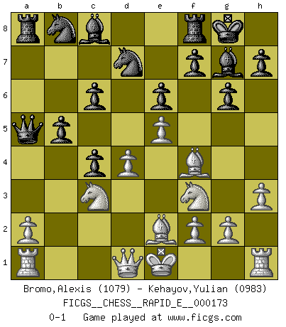 Last move : 0-1 2016 August 22 8:26:25 [Event "FICGS__CHESS__RAPID_E__000173"] [Site "FICGS"] [Date "2016.06.10"] [Round "1"] [White "Bromo,Alexis"] [Black "Kehayov,Yulian"] [Result "0-1"] [WhiteElo "1079"] [BlackElo "0983"] 1.d4 d5 2.c4 c6 3.Nc3 dxc4 4.e3 b5 5.b4 Nf6 6.Nf3 e6 7.e4 g6 8.h3 Bg7 9.e5 Nfd7 10.Bg5 Qc7 11.Bf4 O-O 12.Be2 a5 13.bxa5 Qxa5 0-1 This chess game has been lost on time (started : 2016.06.10 23:19:51) QGD Slav defense Kingside Castling by player Black (move 11) Player Black won this chess game. Follow this game move after move (download)Discovered check is the dive bomber of the Chessboard. (Reuben Fine) Nie in meinem Leben habe ich die französische Verteidigung gespielt, welche die Stumpfsinnigste von allen ist. (Wilhelm Steinitz) El Ajedrez es un juego terrible. Si no dominas el centro, tu oponente tiene una posición mas libre. Si tu tienes el centro, entonces realmente tienes algo de que preocuparte. (Siegbert Tarrasch) Celui qui prend des risques peut perdre, celui qui n'en prend pas perd toujours. (Xavier Tartacover) Beta. Software undergoes beta testing shortly before it's released. Beta is latin for still doesn't work. (Anonymous)