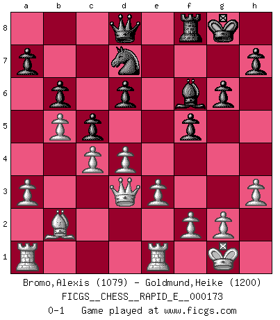 Last move : 0-1 2016 August 13 7:26:49 [Event "FICGS__CHESS__RAPID_E__000173"] [Site "FICGS"] [Date "2016.06.10"] [Round "1"] [White "Bromo,Alexis"] [Black "Goldmund,Heike"] [Result "0-1"] [WhiteElo "1079"] [BlackElo "1200"] 1.d4 Nf6 2.c4 e6 3.a3 b6 4.Nc3 Bb7 5.Nf3 d6 6.e3 c5 7.b4 Ne4 8.Nxe4 Bxe4 9.Be2 g6 10.O-O Bg7 11.Bb2 O-O 12.b5 Nd7 13.Bd3 Bxd3 14.Qxd3 Qc7 15.Rfe1 f5 16.h3 Rad8 17.Ng5 Bf6 18.Nxe6 Qc8 19.Nxd8 Qxd8 0-1 This chess game has been lost on time (started : 2016.06.10 23:19:51) Queen's pawn game Kingside Castling by player White (move 10) Kingside Castling by player Black (move 11) Player Black won this chess game. Follow this game move after move (download)I'm not a materialistic person, in that, I don't suffer the lack or loss of money. The absence of worldly goods I don't look back on. For Chess is a way I can be as materialistic as I want without having to sell my soul. (Jamie Walter Adams) Alle offensichtlichen Züge sehen nach dem Spiel in der Analyse verdächtig aus. (Viktor Kortschnoi) Estaba muy claro de que el punto vulnerable del Gran Maestro Americano (Bobby Fischer) radicaba en las posiciones de doble filo, colgantes, irracionales, donde el siempre falló en encontrar un triunfo aún en una posición de clara victoria. (Efim Geller) Ce qui est bien, c'est d'avoir tout un tas de pièces en prise : l'adversaire ne peut en prendre qu'une à la fois. Cité par Thierry Audin. Don't anthropomorphize computers - they hate it. (Anonymous)