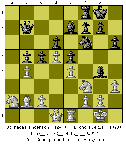 Last move : 1-0 2016 August 13 7:26:49 [Event "FICGS__CHESS__RAPID_E__000173"] [Site "FICGS"] [Date "2016.06.10"] [Round "1"] [White "Barradas,Anderson"] [Black "Bromo,Alexis"] [Result "1-0"] [WhiteElo "1247"] [BlackElo "1079"] 1.e4 e5 2.Nf3 Nc6 3.Bb5 d6 4.O-O Bd7 5.Bxc6 Bxc6 6.Nc3 Nf6 7.d3 h6 8.Re1 a6 9.a3 Be7 10.d4 O-O 11.d5 Bb5 12.a4 Bd7 13.b4 b5 14.axb5 axb5 15.Rxa8 Qxa8 16.Bb2 Qb7 17.Ne2 c6 18.Nc3 c5 19.Na2 Bg4 20.h3 1-0 This chess game has been lost on time (started : 2016.06.10 23:19:51) Ruy Lopez : Old Steinitz defense Kingside Castling by player White (move 4) Kingside Castling by player Black (move 10) Player White won this chess game. Follow this game move after move (download)A bad plan is better than none at all. (Frank Marshall) Alles was am Schachbrett zählt sind gute Züge. (Robert James Fischer) La partida mas dura de ganar es una partida ganada. (Emanuel Lasker) 'L'échange des dames est un coup dur pour les deux adversaires...' Un journaliste lors d'une partie du match Spassky-Fischer Coffee just isn't my cup of tea. (Unknown)