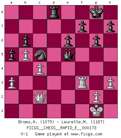 Last move : 0-1 2016 July 10 10:32:15 [Event "FICGS__CHESS__RAPID_E__000173"] [Site "FICGS"] [Date "2016.06.10"] [Round "1"] [White "Bromo,Alexis"] [Black "Leurette,Marc-Antoine"] [Result "0-1"] [WhiteElo "1079"] [BlackElo "1187"] 1.d4 d5 2.c4 e6 3.a3 Nf6 4.Nc3 b6 5.Nf3 Bb7 6.e3 g6 7.Be2 Bg7 8.O-O O-O 9.h3 c5 10.Bd2 cxd4 11.exd4 a6 12.b4 a5 13.b5 Ne4 14.Nxe4 dxe4 15.Ne5 Qxd4 16.Bf4 Bxe5 17.Bxe5 Qxe5 18.Qc2 Nd7 19.Rad1 Nc5 20.f3 exf3 21.Bxf3 Bxf3 22.Rxf3 Rad8 23.Rxd8 Rxd8 0-1 Queen's gambit declined Kingside Castling by player White (move 8) Kingside Castling by player Black (move 8) Player Black won this chess game. Follow this game move after move (download)There are tough players and nice guys, and I'm a tough player. (Bobby Fischer) Es genügt nicht ein guter Spieler zu sein, man muß auch gut spielen. (Siegbert Tarrasch) Buenas posiciones no logran ganar juegos, buenas movidas sí. (Gerald Abrahams) On entre au jeu d'Echecs comme on entre en Religion. Pour le joueur d'Echecs, la partie d'Echecs c'est l'office, la messe, le défilé du 1er Mai, le dépôt de gerbe au Monument aux Morts. C'est un drame sacré. (Michel Roos) There are lots of people who mistake their imagination for their memory. (Josh Bilings)