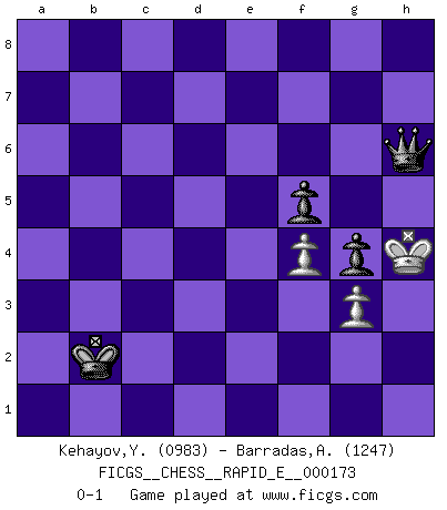 Last move : 0-1 2016 July 30 12:32:6 [Event "FICGS__CHESS__RAPID_E__000173"] [Site "FICGS"] [Date "2016.06.10"] [Round "1"] [White "Kehayov,Yulian"] [Black "Barradas,Anderson"] [Result "0-1"] [WhiteElo "0983"] [BlackElo "1247"] 1.d4 Nf6 2.Nc3 e6 3.a3 d5 4.e3 Nc6 5.Bd3 Bd6 6.Nf3 O-O 7.O-O h6 8.e4 dxe4 9.Nxe4 Nxe4 10.Bxe4 f5 11.Bd3 Ne7 12.c4 b6 13.b4 c5 14.Bb2 Ng6 15.Bc1 Bb7 16.Re1 Bc8 17.bxc5 bxc5 18.dxc5 Bxc5 19.Be3 Bb6 20.Bxb6 Qxb6 21.Ne5 Nf4 22.Bf1 Qc5 23.g3 Ba6 24.Bg2 Rad8 25.Qc1 Nd3 26.Qe3 Qxe3 27.Rxe3 Nxe5 28.Rxe5 Bxc4 29.Bf1 Bd5 30.Bg2 Bxg2 31.Kxg2 Rd5 32.Rxe6 a5 33.a4 Rb8 34.Rae1 Kf8 35.R6e5 Rbd8 36.Rxd5 Rxd5 37.Ra1 Ke7 38.h3 g5 39.Ra2 Kd6 40.Ra3 Kc5 41.h4 Kb4 42.Rf3 Kxa4 43.hxg5 hxg5 44.Re3 Kb4 45.f4 g4 46.Re1 a4 47.Re5 Kc4 48.Rxd5 Kxd5 49.Kf2 Kd4 50.Ke2 Kc3 51.Kd1 Kb2 52.Kd2 a3 53.Ke3 a2 54.Kd4 a1Q 55.Ke5 Qa5+ 56.Kf6 Qd5 57.Kg5 Qe6 58.Kh4 Qh6+ 0-1 Queen's pawn game Kingside Castling by player Black (move 6) Kingside Castling by player White (move 7) 10 pieces endgame at move 43 : White KRPPP , Black KRPPP WHITE : King + 1 Rook 3 Pawns BLACK : King + 1 Rook 3 Pawns 9 pieces endgame at move 43 : White KRPP , Black KRPPP WHITE : King + 1 Rook 2 Pawns BLACK : King + 1 Rook 3 Pawns 8 pieces endgame at move 48 : White KRPP , Black KPPP WHITE : King + 1 Rook 2 Pawns BLACK : King + 3 Pawns 7 pieces endgame at move 48 : White KPP , Black KPPP WHITE : King + 2 Pawns BLACK : King + 3 Pawns Promotion Queen by player Black (move 54) Player Black won this chess game. Follow this game move after move (download)Discovered check is the dive bomber of the Chessboard. (Reuben Fine) Er war ein guter Schachspieler, aber ich kann Leute nicht ausstehen, die 'Heil Hitler' rufen (Über Alexander Aljechin). (Miguel Najdorf) Sin errores no puede haber brillantez. (Emanuel Lasker) Vous savez, camarade Pachman, je n'éprouve pas de plaisir à être ministre, je jouerais plutôt aux échecs comme vous, ou alors ferais une révolution au Venezuela. (Che Guevara à Ludek Pachman, 'Checkmate in Prague', 1975) When I took office, only high energy physicists had ever heard of what is called the World Wide Web... Now even my cat has its own page. (Bill Clinton, 1996)
