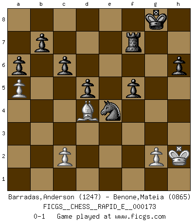 Last move : 0-1 2016 July 12 1:31:32 [Event "FICGS__CHESS__RAPID_E__000173"] [Site "FICGS"] [Date "2016.06.10"] [Round "1"] [White "Barradas,Anderson"] [Black "Benone,Mateia"] [Result "0-1"] [WhiteElo "1247"] [BlackElo "0865"] 1.e4 e5 2.Nf3 Nf6 3.Nxe5 d6 4.Nf3 Nxe4 5.d4 Be7 6.Bd3 d5 7.O-O O-O 8.Re1 Nf6 9.Nc3 Bg4 10.h3 Bh5 11.Be2 Re8 12.Ne5 Bxe2 13.Qxe2 Nbd7 14.Ng4 Bb4 15.Qd1 Bxc3 16.bxc3 Nxg4 17.hxg4 Nf6 18.Bg5 Rxe1+ 19.Qxe1 h6 20.Bh4 g5 21.Bg3 Nxg4 22.f3 Nf6 23.Qe5 c6 24.f4 Ne4 25.Bh2 Nxc3 26.fxg5 Qxg5 27.Re1 Ne4 28.Qc7 Qd2 29.Bg3 Qxd4+ 30.Kh2 Qg7 31.Re3 f5 32.Qf4 Rf8 33.a4 Kh7 34.a5 a6 35.Rb3 Rf7 36.Qb8 Nc5 37.Be5 Qg8 38.Qxg8+ Kxg8 39.Rg3+ Kh7 40.Bd4 Ne4 41.Rg8 Kxg8 0-1 Petrov : Classical attack Kingside Castling by player White (move 7) Kingside Castling by player Black (move 7) Player Black won this chess game. Follow this game move after move (download)I guess a certain amount of temperament is expected of Chess geniuses. (Ron Gross) Wie gewinnt Tal? Er entwickelt alle seine Figuren in die Brettmitte und opfert sie dann irgendwo. (Robert James Fischer) La táctica fluye a partir de una posición superior. (Bobby Fischer) Avec des compensations pour le matériel en plus... (Anonyme) In every real man a child is hidden that wants to play. (Friedrich Nietzsche)