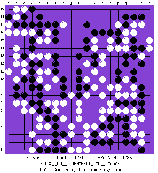 Last move : 1-0 2007 September 5 23:25:46 [Event "FICGS__GO__TOURNAMENT_DAN__000005"] [Site "FICGS"] [Date "2007.03.26"] [Round "1"] [Black "de Vassal,Thibault"] [White "Ioffe,Nick"] [Result "1-0"] [Rating 1 "1231"] [Rating 2 "1286"] 1.q4 d3 2.q17 c16 3.e17 h17 4.d15 d16 5.e16 e15 6.d14 f15 7.c18 b14 8.c13 d18 9.d17 b18 10.c17 b16 11.b17 b13 12.b11 c12 13.d12 c11 14.c10 b12 15.d11 b10 16.b9 a11 17.d9 a17 18.g16 f16 19.f17 e13 20.g17 d13 21.g15 f13 22.l17 q6 23.q9 n6 24.n4 r3 25.q3 r4 26.q5 r5 27.k4 c6 28.q12 f9 29.k13 q15 30.o16 r17 31.r18 s17 32.s18 q16 33.r14 q14 34.q13 p17 35.q18 o14 36.p16 m14 37.l15 n12 38.d7 d6 39.e8 g7 40.c8 e10 41.d10 b7 42.e6 e5 43.f6 g6 44.f5 e4 45.k11 n10 46.r7 r6 47.o8 n8 48.g3 m4 49.m3 n3 50.n2 o3 51.o2 l3 52.m2 l4 53.o5 o7 54.p7 p6 55.q7 o9 56.k3 l2 57.k2 l1 58.r2 s2 59.q2 f2 60.g2 f4 61.g5 k6 62.k9 l10 63.k10 h5 64.g4 h2 65.g1 k5 66.g13 f11 67.g12 e11 68.r15 r16 69.g11 o15 70.n16 j4 71.h3 j3 72.j2 j1 73.h1 k1 74.b8 h2 75.s6 s5 76.s7 p8 77.s1 o6 78.p5 n5 79.o4 q10 80.r10 r9 81.r11 q8 82.s9 r8 83.s8 s13 84.r13 t14 85.s14 t15 86.p15 p14 87.s12 j8 88.h9 s3 89.f1 e2 90.e1 d1 91.m13 n13 92.l14 l8 93.l9 m9 94.k8 k7 95.h8 h7 96.m12 g10 97.h10 m11 98.p10 p9 99.p11 m15 100.m16 c19 101.e18 b19 102.a18 a16 103.d19 f7 104.e7 c7 105.e9 l12 106.e12 1-0 Here are the names of the openings (joseki) played in the four corners : Corner d16 : c16 e17 Komoku (Somok, Xiao~mu`) 3-4 Point. The komoku (3-4) point is the traditional corner enclosure move.. Ikken Kakari (Hankan Keolch'im, Yi Gua`jiao~, 1-Space Low Pincer). The small knight move is the basic approach move to the 3-4 point stone. It has been continually used for over four centuries. There are limitless variations, with new moves constantly being discovered. Black 2 opens the door to a treaure store of joseki. Corner d4 : d3 b9 Komoku (Somok, Xiao~mu`) 3-4 Point. The komoku (3-4) point is the traditional corner enclosure move.. Corner q4 : q4 q6 Hoshi (Hwajeom, Seongjeom, Xingwei`) 4-4 Point. The star or hoshi (4-4) point, emphasizing influence at the potential expense of territory. Ikken Takagakari (Hankan Nop'dakeolch'im, Yi Gaojia, 1-Space High Approach). Black typically responds at 6-4 or 3-10. Black 4-10 is played when Black finds play on the right side advantageous. Black 4-8 or 3-8 may be played when Black has support at top. Player Black won this Go (weiqi, baduk) game. Follow this game move after move (download)You have to like to win, and to learn to recognize the errors that gave you the victory. (Pierre Audouard) A married woman is like a fish riding a bicycle. (Rodolfo d'Ettorre)