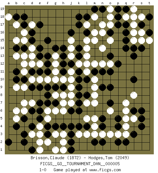 Last move : 1-0 2007 August 9 15:37:15 [Event "FICGS__GO__TOURNAMENT_DAN__000005"] [Site "FICGS"] [Date "2007.03.26"] [Round "1"] [Black "Brisson,Claude"] [White "Hodges,Tom"] [Result "1-0"] [Rating 1 "1872"] [Rating 2 "2049"] 1.q16 d17 2.c3 q4 3.d15 c13 4.c17 c16 5.d16 c15 6.c14 d14 7.b14 b17 8.c18 b15 9.e17 b13 10.r6 o3 11.s4 r8 12.r3 r5 13.s5 q6 14.s6 q7 15.r13 o17 16.m17 o15 17.j16 r17 18.q17 q18 19.p18 r18 20.p17 s15 21.q14 o18 22.p19 n14 23.e14 d13 24.e13 e12 25.k14 m16 26.l16 m15 27.o13 m12 28.r10 c6 29.n11 l14 30.m11 l11 31.k13 l12 32.j4 d3 33.d4 e3 34.d6 d7 35.c5 c7 36.e6 h3 37.h4 g3 38.g4 g12 39.g14 n12 40.o11 o12 41.p12 m10 42.n9 k3 43.k4 l3 44.f8 h7 45.e9 d10 46.d9 c9 47.c10 c11 48.b10 b9 49.d11 e10 50.e11 f10 51.f11 g10 52.f12 d12 53.f13 f5 54.f4 e4 55.e5 f6 56.e7 h6 57.f3 f2 58.j3 h2 59.c2 e1 60.d1 e2 61.j2 g1 62.j1 h1 63.k7 g8 64.k10 l17 65.k17 m18 66.l18 n17 67.l10 l17 68.n4 n3 69.p5 q5 70.p4 q3 71.m19 l13 72.p2 p3 73.q2 m4 74.n5 l5 75.j6 b5 76.b4 b6 77.a2 l7 78.l8 m7 79.o7 m8 80.k8 m9 81.o9 j11 82.k11 k12 83.j12 j10 84.l4 m5 85.m2 m3 86.n2 o6 87.s14 r15 88.q15 r16 89.b18 a18 90.q19 r19 91.t16 t15 92.t18 t17 93.s17 s18 94.o16 n16 95.h12 g11 96.h9 j9 97.g9 j8 98.g7 j7 99.k6 h8 100.r14 s16 101.n19 o19 102.k18 l15 103.f7 g6 104.f9 g13 105.f15 j13 106.h13 j14 107.h11 h10 108.h14 j15 109.b11 c12 110.k9 1-0 Here are the names of the openings (joseki) played in the four corners : Corner d16 : d17 d15 Komoku (Somok, Xiao~mu`) 3-4 Point. The komoku (3-4) point is the traditional corner enclosure move.. Ikken Takagakari (Hankan Nop'dakeolch'im, Yi Gaogua`jiao~, 1-Space High Approach). The 5-4 approach move has become more popular in modern times, as modern Go emphasizes speed and influence. Corner q4 : q4 r6 Hoshi (Hwajeom, Seongjeom, Xingwei`) 4-4 Point. The star or hoshi (4-4) point, emphasizing influence at the potential expense of territory. Ikken Kakari (Hankan Keolch'im, Yi Gua`jiao~, 1-Space Low Approach). Black 2 is the standard approach move to the 4-4. Corner d4 : c3 c6 San-San (Sam-Sam, San-San) 3-3 Point. The San-San (3-3) point, emphasizing territory at the expense of influence. Nikken Kakari (Dukan Keolch'im, E`r Gua`jiao~, 2-Space Low Approach). Black can thwart White's strategy with a play at 9-4. Player Black won this Go (weiqi, baduk) game. Follow this game move after move (download)Don't overlook the edge of the board. (Anonymous) You must do what you feel is right... of course. (Obi-Wan Kenobi in Star Wars ep.4)