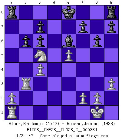Last move : 1/2-1/2 2016 November 4 22:57:20 [Event "FICGS__CHESS__CLASS_C__000234"] [Site "FICGS"] [Date "2016.06.14"] [Round "1"] [White "Block,Benjamin"] [Black "Romano,Jacopo"] [Result "1/2-1/2"] [WhiteElo "1742"] [BlackElo "1938"] 1.e4 e5 2.Nf3 Nc6 3.Bb5 Nf6 4.O-O Nxe4 5.d4 Nd6 6.Bxc6 dxc6 7.dxe5 Nf5 8.Qxd8+ Kxd8 9.Rd1+ Ke8 10.Nc3 Ne7 11.h3 Ng6 12.b3 Be7 13.Bb2 Bd7 14.Ne4 Nf4 15.Re1 Ne6 16.c4 a5 17.Nd4 Bb4 18.Re3 Nxd4 19.Bxd4 Be6 20.Rg3 g6 21.Rf3 a4 22.Bc5 Bxc5 23.Nxc5 axb3 24.Rxb3 b6 1/2-1/2 Ruy Lopez : Berlin defense, Open variation Kingside Castling by player White (move 4) This chess game ended in a draw. Follow this game move after move (download)Don't even mention losing to me. I can't stand to think of it. (Bobby Fischer) Smyslow ist ein Beweis dafür, dass ich noch zehn Jahre spielen kann! [der 75 jährige über den 85 jährigen] (Viktor Kortschnoi) Creo que una cierta cantidad de temperamento es esperada de los genios del Ajedrez. (Ron Gross) Les Echecs représentent une sphère d'idées créatrices basée sur la volonté des deux protagonistes. (Smyslov) No man has ever achieved immortality in his own life time. (Unknown)