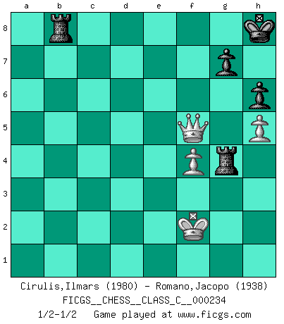 Last move : 1/2-1/2 2016 October 3 13:54:21 [Event "FICGS__CHESS__CLASS_C__000234"] [Site "FICGS"] [Date "2016.06.14"] [Round "1"] [White "Cirulis,Ilmars"] [Black "Romano,Jacopo"] [Result "1/2-1/2"] [WhiteElo "1980"] [BlackElo "1938"] 1.b4 e5 2.a3 d5 3.Bb2 Bd6 4.e3 Nf6 5.c4 c6 6.Nc3 d4 7.Nce2 c5 8.bxc5 Bxc5 9.Nf3 Nc6 10.Ng3 O-O 11.Qc2 h6 12.Be2 Qd6 13.O-O Rd8 14.exd4 Bxd4 15.Nxd4 Nxd4 16.Bxd4 Qxd4 17.Rad1 Be6 18.d3 Rac8 19.Qb3 b6 20.Rfe1 Nd7 21.Bf3 Nc5 22.Qc2 Qd6 23.h3 Rc7 24.Qc3 f6 25.Ne2 Bf7 26.d4 e4 27.dxc5 Qxd1 28.Rxd1 Rxd1+ 29.Kh2 exf3 30.Qxf3 Rd8 31.cxb6 axb6 32.Qe3 Rc6 33.Qe7 Re8 34.Qd7 Rxc4 35.Nd4 Ra8 36.Nb5 Rca4 37.Qc6 Rb8 38.Qc7 R4a8 39.Nd6 Rf8 40.Nxf7 Rxf7 41.Qxb6 Rxa3 42.Qd8+ Kh7 43.Qd5 R3a7 44.h4 Rf8 45.g4 Re7 46.f3 Re3 47.Kg3 Re5 48.Qd3+ Kh8 49.h5 Rg5 50.Qd6 Ra8 51.Kf2 f5 52.Qd5 Rb8 53.f4 Rxg4 54.Qxf5 1/2-1/2 Polish (Sokolsky) opening Kingside Castling by player Black (move 10) Kingside Castling by player White (move 13) 10 pieces endgame at move 53 : White KQPP , Black KRRPPP WHITE : King + 1 Queen 2 Pawns BLACK : King + 2 Rooks 3 Pawns 9 pieces endgame at move 54 : White KQPP , Black KRRPP WHITE : King + 1 Queen 2 Pawns BLACK : King + 2 Rooks 2 Pawns This chess game ended in a draw. Follow this game move after move (download)I have always a slight feeling of pity for the man who has no knowledge of Chess. (Siegbert Tarrasch) Ich bin stolz ein Bulgare zu sein. (Veselin Topalov) Todos los Maestros de Ajedrez fueron un día unos principiantes. (Chernev) L'ordinateur a tué l'originalité. Il n'y a plus guère d'aventures sur l'échiquier. (Jacob Murray) The ultimate in disposing one's troops is to be without ascertainable shape. Then the most penetrating spies cannot pry in nor can the wise lay plans against you. (Sun Tzu)