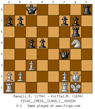 Last move : 0-1 2016 June 23 22:57:22 [Event "FICGS__CHESS__CLASS_C__000234"] [Site "FICGS"] [Date "2016.06.14"] [Round "1"] [White "Ranalli,Emmanuel Eduardo"] [Black "Knittel,Martin"] [Result "0-1"] [WhiteElo "1794"] [BlackElo "1694"] 1.d4 d5 2.Nf3 Nf6 3.Bf4 e6 4.e3 c5 5.c3 Nc6 6.Bd3 Bd6 7.Ne5 Qc7 8.O-O Nxe5 9.dxe5 Bxe5 10.Bxe5 Qxe5 11.Nd2 Bd7 12.Nf3 Qc7 13.Nd2 h5 14.e4 Ng4 15.g3 O-O-O 16.exd5 exd5 17.Qf3 h4 18.Bf5 Nxh2 19.Kxh2 hxg3+ 20.Kg1 g2 21.Bxd7+ Rxd7 22.Qxg2 Rd6 23.Nf3 Rg6 24.Ng5 Qf4 0-1 Queen's Bishop game Kingside Castling by player White (move 8) Queenside Castling by player Black (move 15) Player Black won this chess game. Follow this game move after move (download)Chess is in its essence a game, in its form an art, and in its execution a science. (Baron Tassilo) Schon mancher Spieler hat aufgegeben, um zu vermeiden, daß er eine Figur verliert. (Savielly Grigorievitsch Tartakower) El Ajedrez se juega con la mente... ¡no con las manos!. (Renaud y Kahn) Les échecs sont plus proches de l'art de l'assassinat que de l'art de la guerre. (Arturo Perez-Reverte) In fact if nothing is done against this teddy bear, hereby I announce that I would quit chess, rapid chess, blitz chess, postal chess, email chess, server chess and correspondence chess I will then switch to a table game where teddy bears aren't going to be seen for a while, like Poker, or Roulette, all 18+ games. (Elmer Valderrama)