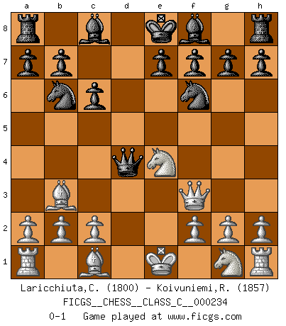 Last move : 0-1 2016 August 1 17:28:2 [Event "FICGS__CHESS__CLASS_C__000234"] [Site "FICGS"] [Date "2016.06.14"] [Round "1"] [White "Laricchiuta,Claudio"] [Black "Koivuniemi,Raimo"] [Result "0-1"] [WhiteElo "1800"] [BlackElo "1857"] 1.e4 c6 2.d4 d5 3.Nd2 dxe4 4.Nxe4 Nd7 5.Bc4 Ngf6 6.Qf3 Nb6 7.Bb3 Qxd4 0-1 This chess game has been lost on time (started : 2016.06.14 13:57:29) Caro-Kann : 3.Nd2 Player Black won this chess game. Follow this game move after move (download)Is Bobby Fischer quite sane ? (Salo Flohr) Ich suche im Schach immer etwas Eigenes. Riskantes Spiel im Stile schachlicher Musketiere ist nicht meine Sache, auch wenn es vielen Freunden scharfer Wendungen gefällt. (Anatoly Karpov) Antes de los Finales, los dioses han colocado el Juego Medio. (Siegbert Tarrasch) Fischer est le meilleur joueur du monde et Karpov n'est qu'un joueur de bistrot. (Garry Kasparov, agé de 16 ans) Are you threatening me, Master Jedi ? (Chancellor Palpatine in Star Wars ep.3)