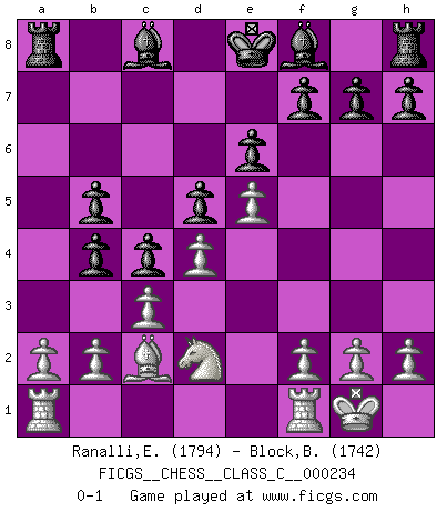 Last move : 0-1 2016 August 31 17:48:8 [Event "FICGS__CHESS__CLASS_C__000234"] [Site "FICGS"] [Date "2016.06.14"] [Round "1"] [White "Ranalli,Emmanuel Eduardo"] [Black "Block,Benjamin"] [Result "0-1"] [WhiteElo "1794"] [BlackElo "1742"] 1.d4 d5 2.Nf3 e6 3.Bf4 c5 4.c3 Nf6 5.e3 Nc6 6.Bd3 Qb6 7.Qb3 c4 8.Qxb6 axb6 9.Bc2 b5 10.Nbd2 b4 11.O-O Nh5 12.Ne5 Nxf4 13.exf4 Nxe5 14.fxe5 b5 0-1 Queen's pawn game Kingside Castling by player White (move 11) Player Black won this chess game. Follow this game move after move (download)Chess teaches you to control the initial excitement you feel when you see something that looks good and it trains you to think objectively when you're in trouble. (Stanley Kubrick) Capablanka war das größte Genie der Schachgeschichte! Aber denken sie nicht er habe nichts vom Schach verstanden. Er wusste nur soviel wie er wissen musste um seine Ziele zu erreichen. (Mikhail Moiseyevich Botvinik) Del Ajedrez se ha dicho que la vida no es lo suficientemente larga para él, pero eso es culpa de la vida, no del Ajedrez. (William Ewart Napier) Roi des jeux et jeu des rois, les échecs portent en eux un sentiment d'infini. Ils donnent à celui qui s'est efforcé d'en approfondir les arcanes l'impression de n'être pas à la mesure de l'homme; en fait, ils constituent un résumé de l'univers, un microcosme, et figurent cette grande échelle qui, dans les plans de la lumière descend jusqu'à la matière, qui des abîmes insondables remonte jusqu'en l'infini de Dieu. (Pyrame) A good programmer is someone who always looks both ways before crossing a one-way street. (Doug Linder)