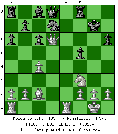 Last move : 1-0 2016 June 26 1:25:46 [Event "FICGS__CHESS__CLASS_C__000234"] [Site "FICGS"] [Date "2016.06.14"] [Round "1"] [White "Koivuniemi,Raimo"] [Black "Ranalli,Emmanuel Eduardo"] [Result "1-0"] [WhiteElo "1857"] [BlackElo "1794"] 1.d4 d5 2.c4 c6 3.Nf3 a6 4.Nc3 e6 5.e4 dxe4 6.Nxe4 Nf6 7.Nxf6+ Qxf6 8.Bd3 h6 9.O-O Bd6 10.Bc2 Nd7 11.Bd2 O-O 12.Bc3 e5 13.Re1 exd4 14.Bxd4 Qd8 15.Qd3 f5 16.Bxg7 Kxg7 17.Qxd6 1-0 QGD Slav : 3.Nf3 Kingside Castling by player White (move 9) Kingside Castling by player Black (move 11) Player White won this chess game. Follow this game move after move (download)Chess holds its master in its own bonds, shackling the mind and brain so that the inner freedom of the very strongest must suffer. (Albert Einstein) Kleine Schachspieler machen Mist, und große Schachspieler machen Mist, aber große machen weniger Mist. (Fritz Sämisch) Nada excita más a Grandes Maestros aburridos que una novedad teórica. (Dominic Lawson) Le jeu d'échecs est comme rejeté hors du temps. (Antoine de Saint-Exupéry) Pretend inferiority and encourage his arrogance. (Sun Tzu)