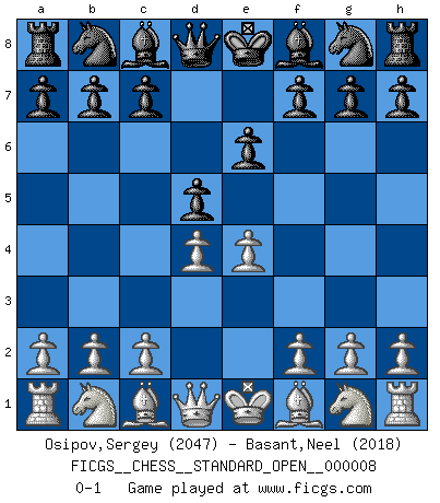 Last move : 0-1 2016 June 20 8:50:47 [Event "FICGS__CHESS__STANDARD_OPEN__000008"] [Site "FICGS"] [Date "2016.06.16"] [Round "2"] [White "Osipov,Sergey"] [Black "Basant,Neel"] [Result "0-1"] [WhiteElo "2047"] [BlackElo "2018"] 1.e4 e6 2.d4 d5 0-1 French defense Player Black won this chess game. Follow this game move after move (download)It is the aim of the modern school, not to treat every position according to one general law, but according to the principle inherent in the position. (Richard Reti) Das Spiel gibt uns die Genugtuung, die das Leben uns versagt. (Emanuel Lasker) Las ideas audaces son como las piezas del Ajedrez que avanzan hacia adelante. Ellas pueden ser vencidas, pero también pueden iniciar una partida victoriosa. (Goethe) Un footballeur joue avec ses pieds, parfois avec sa tête. Un joueur d'échecs ne joue qu'avec sa tête. Et quand il ne joue plus, il meurt. (Jacob Murray) Perhaps the current trend of many chess professionals taking up the more lucrative pastime of poker is not a wholly negative one. It may not be too late for humans to relearn how to take risks in order to innovate and thereby maintain the advanced lifestyles we enjoy. And if it takes a poker-playing supercomputer to remind us that we can't enjoy the rewards without taking the risks, so be it. (The Chess Master and the Computer, by Garry Kasparov - 2010)