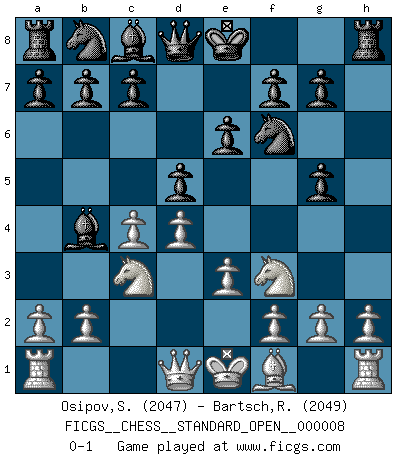 Last move : 0-1 2016 June 17 17:30:27 [Event "FICGS__CHESS__STANDARD_OPEN__000008"] [Site "FICGS"] [Date "2016.06.16"] [Round "1"] [White "Osipov,Sergey"] [Black "Bartsch,Reinhard Andrea"] [Result "0-1"] [WhiteElo "2047"] [BlackElo "2049"] 1.d4 Nf6 2.c4 e6 3.Nf3 d5 4.Nc3 Bb4 5.Bg5 h6 6.e3 hxg5 0-1 Queen's pawn game Player Black won this chess game. Follow this game move after move (download)The battle for the ultimate truth will never be won. And that's why Chess is so fascinating. (Hans Kmoch) Bobby Fischer ist kein Vorbild für die heutige Jugend. (Viktor Kortschnoi) Mis oponentes también hacen buenas movidas. A veces yo no tomo esas cosas en consideración. (Bobby Fischer) Botvinnik disait en comparant les échecs à la musique: Il existe une science dont le but est l'étude de l'acoustique et des sons. Mais il y a aussi un art qui se sert de l'océan des sons : c'est la musique. De toute évidence, il en est de même pour la pensée. La logique est l'étude des lois de la réflexion et les échecs reflètent, en tant qu'art, le côté logique de la réflexion, sous la forme d'images artistiques... Extrait de Fischer - Spassky, Reykjavik 1972 par Alexander & F. Wyndham (Ed. Solar), p 37. The hypothalamus is one of the most important parts of the brain, involved in many kinds of motivation, among other functions. The hypothalamus controls the 'Four Fs: Fighting, Fleeing, Feeding and Mating. (Unknown author)