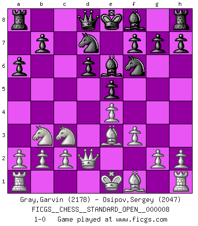 Last move : 1-0 2016 June 17 17:31:2 [Event "FICGS__CHESS__STANDARD_OPEN__000008"] [Site "FICGS"] [Date "2016.06.16"] [Round "1"] [White "Gray,Garvin"] [Black "Osipov,Sergey"] [Result "1-0"] [WhiteElo "2178"] [BlackElo "2047"] 1.e4 c5 2.Nf3 d6 3.d4 cxd4 4.Nxd4 Nf6 5.Nc3 a6 6.Be3 e5 7.Nb3 Be6 8.Qd2 Nbd7 9.f3 1-0 Sicilian : Najdorf, Byrne (English) attack Player White won this chess game. Follow this game move after move (download)There are tough players and nice guys, and I'm a tough player. (Bobby Fischer) Kann Schach nicht schließlich das Nationalspiel der Deutschen werden? Und welche weiteren Ausblicke bieten sich dann dar! Welche Hebung des allgemeinen Kultur-Niveaus, ja der Moral, wenn das Schachbrett den Kartentisch verdrängen würde! Wahrlich, ein Ziel, des Schweißes der Edlen wert! (Siegbert Tarrasch) Yo nunca en mi vida he jugado la Defensa Francesa, que viene siendo la más aburrida de todas las Aperturas. (Wilhelm Steinitz) A chaque perte on perd un peu de soi. (Joël Lautier) Computer Science is no more about computers than astronomy is about telescopes. (Edsger W. Dijkstra)