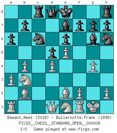 Last move : 1-0 2016 November 22 6:4:1 [Event "FICGS__CHESS__STANDARD_OPEN__000008"] [Site "FICGS"] [Date "2016.06.16"] [Round "2"] [White "Basant,Neel"] [Black "Bullerkotte,Frank"] [Result "1-0"] [WhiteElo "2018"] [BlackElo "1898"] 1.e4 c6 2.d4 d5 3.e5 c5 4.c3 Nc6 5.Be2 Bf5 6.Nf3 e6 7.O-O Bg6 8.a3 Nh6 9.b4 cxd4 10.cxd4 Nf5 11.Bb2 Be7 12.Nbd2 a6 13.Nb3 Rc8 14.g4 Nh6 15.Ne1 1-0 This chess game has been lost on time (started : 2016.06.16 4:18:20) Caro-Kann : Advance variation Kingside Castling by player White (move 7) Player White won this chess game. Follow this game move after move (download)Do you realize Fischer almost never has any bad pieces? He exchanges them, and the bad pieces remain with his opponents. (Yuri Balashov) Aljechin war kein Nazi. Er war ein Opportunist. Ein schrecklicher Mann. Er liebte Geld über alles und würde für Geld ein Jude, ein Katolik oder ein Protestant werden. (Miguel Najdorf) Preferería tener un Peón que un dedo. (Reuben Fine) Le succès, c'est être capable d'aller d'échec en échec sans perdre son enthousiasme. (Winston Churchill) Tomorrow's what you make of it. (Horatio Caine, C.S.I. Miami)