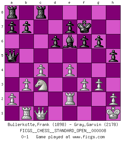 Last move : 0-1 2016 November 20 5:16:22 [Event "FICGS__CHESS__STANDARD_OPEN__000008"] [Site "FICGS"] [Date "2016.06.16"] [Round "1"] [White "Bullerkotte,Frank"] [Black "Gray,Garvin"] [Result "0-1"] [WhiteElo "1898"] [BlackElo "2178"] 1.d4 Nf6 2.c4 g6 3.Nc3 Bg7 4.e4 d6 5.f3 O-O 6.Be3 c5 7.Nge2 Qa5 8.Nc1 cxd4 9.Nb3 Qh5 10.Nxd4 Nc6 11.Qd2 Nxd4 12.Bxd4 Be6 13.Be2 Rfc8 14.b3 Qa5 15.Rb1 Nh5 16.Bxg7 Kxg7 17.O-O Nf4 18.Rf2 Qg5 19.Kh1 f6 20.Qe1 h5 21.g3 Nxe2 22.Rxe2 Qa5 23.Qc1 Kf7 0-1 This chess game has been lost on time (started : 2016.06.16 4:18:20) King's Indian : Saemisch, 5...O-O Kingside Castling by player Black (move 5) Kingside Castling by player White (move 17) Player Black won this chess game. Follow this game move after move (download)Fischer sacrificed virtually everything most of us weakies (to use his term) value, respect, and cherish, for the sake of an artful, often beautiful board game, for the ambivalent privilege of being its greatest master. (Paul Kollar) Es gibt keine einzige Frau, der ich nicht einen Springer vorgeben könnte und trotzdem gewänne. (Robert James Fischer) El Ajedrez es la vida. (Bobby Fischer) J'apprécie les joueurs d'est-indienne, c'est grâce à eux que je nourris ma famille depuis tant d'années. (Petrosian) A belief is an idea the mind possesses, an idea that possesses the mind. (Robert Oxden Bolton)