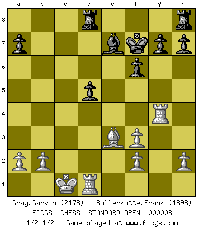 Last move : 1/2-1/2 2016 October 3 14:3:30 [Event "FICGS__CHESS__STANDARD_OPEN__000008"] [Site "FICGS"] [Date "2016.06.16"] [Round "2"] [White "Gray,Garvin"] [Black "Bullerkotte,Frank"] [Result "1/2-1/2"] [WhiteElo "2178"] [BlackElo "1898"] 1.e4 c6 2.Nf3 d5 3.exd5 cxd5 4.d4 Nc6 5.c4 Nf6 6.Nc3 Bg4 7.cxd5 Nxd5 8.Qb3 Bxf3 9.gxf3 e6 10.Qxb7 Nxd4 11.Bb5+ Nxb5 12.Qc6+ Ke7 13.Qxb5 Qd7 14.Nxd5+ Qxd5 15.Bg5+ f6 16.Qxd5 exd5 17.Be3 Ke6 18.O-O-O Rd8 19.Rhe1 Kf7 20.Rg1 Be7 21.Rg4 1/2-1/2 Caro-Kann defense Queenside Castling by player White (move 18) This chess game ended in a draw. Follow this game move after move (download)A player surprised is half beaten. (Proverb) Herr Iljumschinow ist ein etwas merkwürdiger Geschäftsmann: Er arbeitet zusammen mit Leuten wie Muammar al-Gaddafi; früher ist das Saddam Hussein gewesen. (Joel Lautier) Uno no tiene que jugar muy bien, es suficiente jugar mejor que el oponente. (Siegbert Tarrasch) Roi des jeux et jeu des rois, les échecs portent en eux un sentiment d'infini. Ils donnent à celui qui s'est efforcé d'en approfondir les arcanes l'impression de n'être pas à la mesure de l'homme; en fait, ils constituent un résumé de l'univers, un microcosme, et figurent cette grande échelle qui, dans les plans de la lumière descend jusqu'à la matière, qui des abîmes insondables remonte jusqu'en l'infini de Dieu. (Pyrame) Even the best needles are not sharp at both ends. (Chinese proverb)