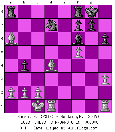 Last move : 0-1 2016 November 10 15:31:4 [Event "FICGS__CHESS__STANDARD_OPEN__000008"] [Site "FICGS"] [Date "2016.06.16"] [Round "1"] [White "Basant,Neel"] [Black "Bartsch,Reinhard Andrea"] [Result "0-1"] [WhiteElo "2018"] [BlackElo "2049"] 1.e4 c5 2.Nf3 d6 3.d4 cxd4 4.Nxd4 Nf6 5.Nc3 a6 6.h3 e6 7.g4 h6 8.Bg2 Be7 9.Qd3 Nfd7 10.Be3 b5 11.e5 Nxe5 12.Qe2 d5 13.Nf5 b4 14.Nxd5 exd5 15.O-O-O Bxf5 16.gxf5 Nbd7 17.Bxd5 Rc8 18.f4 Qc7 19.fxe5 Qxe5 20.Bf3 Bf6 21.Bd4 Qxe2 22.Bxe2 O-O 23.Bxa6 Ra8 0-1 This chess game has been lost on time (started : 2016.06.16 4:18:20) Sicilian : Najdorf, Adams attack Queenside Castling by player White (move 15) Kingside Castling by player Black (move 22) Player Black won this chess game. Follow this game move after move (download)The chessboard is the world, the pieces are the phenomena of the Universe, the rules of the game are what we call the laws of Nature and the player on the other side is hidden from us. (Thomas Huxley) Ich kenne keine einzige Person, die behaupten würde, Garri Kasparow sei ein guter Mensch (Nigel Short) Un jugador que es sorprendido, esta derrotado a medias. (Proverbio) Tout change constamment, y compris dans le monde des Echecs. (Botvinnik) When you stop learning you start dying. (Scott Adams)