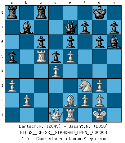 Last move : 1-0 2016 November 10 15:31:4 [Event "FICGS__CHESS__STANDARD_OPEN__000008"] [Site "FICGS"] [Date "2016.06.16"] [Round "2"] [White "Bartsch,Reinhard Andrea"] [Black "Basant,Neel"] [Result "1-0"] [WhiteElo "2049"] [BlackElo "2018"] 1.c4 e6 2.d4 Nf6 3.Nf3 d5 4.Nc3 Be7 5.Bf4 O-O 6.a3 Nbd7 7.e3 c6 8.Rc1 Nh5 9.Bg3 a6 10.Be2 g6 11.c5 Nxg3 12.hxg3 Bf6 13.e4 Bg7 14.O-O a5 15.Re1 b6 16.cxb6 Nxb6 17.e5 Bh6 18.Rc2 Qe7 19.Nb1 Bb7 20.Nbd2 Rfc8 21.Nb3 Nd7 22.Nc5 Nxc5 23.Rxc5 1-0 This chess game has been lost on time (started : 2016.06.16 4:18:20) English Opening Kingside Castling by player Black (move 5) Kingside Castling by player White (move 14) Player White won this chess game. Follow this game move after move (download)For surely of all the drugs in the world, Chess must be the most permanently pleasurable. (Assiac) Ein Schachspiel besteht aus drei Phasen: Die erste, wenn du hofftst den Vorteil zu haben, die zweite, wenn du glaubst einen Vorteil zu haben, und die dritte.... wenn du weißt Du wirst verlieren. (Savielly Grigorievitsch Tartakower) a manera como él juega al Ajedrez, demuestra la completa naturaleza de un hombre. (Stanley Ellin) Votre seul travail dans les ouvertures est d'obtenir un milieu de partie jouable. (Lajos Portish) Humor is by far the most significant activity of the human brain. (Edward De Bono)