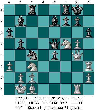Last move : 1-0 2016 September 6 9:0:36 [Event "FICGS__CHESS__STANDARD_OPEN__000008"] [Site "FICGS"] [Date "2016.06.16"] [Round "2"] [White "Gray,Garvin"] [Black "Bartsch,Reinhard Andrea"] [Result "1-0"] [WhiteElo "2178"] [BlackElo "2049"] 1.e4 c5 2.Nf3 d6 3.d4 cxd4 4.Nxd4 Nf6 5.Nc3 a6 6.Be3 e6 7.Qd2 b5 8.f3 Nbd7 9.O-O-O Bb7 10.a3 Rc8 11.Kb1 Nb6 12.g4 Be7 13.g5 Nfd7 14.Rg1 Ne5 15.f4 Nec4 16.Qe1 Qc7 17.Bxc4 Nxc4 18.Rd3 O-O 19.f5 d5 20.Bc1 dxe4 21.Rh3 exf5 22.Qh4 h6 23.Nxf5 Qe5 24.Qg4 1-0 Sicilian : Najdorf, Byrne (English) attack Queenside Castling by player White (move 9) Kingside Castling by player Black (move 18) Player White won this chess game. Follow this game move after move (download)With or without the title, Bobby Fischer was unquestionably the greatest player of his time. (Burt Hochberg) Man braucht nicht immer den besten Zug zu spielen: Ein Zug muß aktiv, unternehmungslustig, korrekt und schön sein. (David Bronstein) ¿Esta Bobby Fischer algo cuerdo?. (Salo Flohr) Toutes les manuvres exécutées sur une colonne ouverte ont pour but ultime l'intrusion définitive sur la septième ou la huitième rangée, en plein cur de la position ennemie. (Aaron Nimzovitch) The greatest con, that he ever pulled... was making you believe... that he is you. (Revolver, movie)