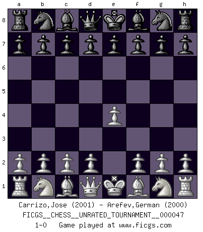 Last move : 1-0 2016 July 30 4:56:47 [Event "FICGS__CHESS__UNRATED_TOURNAMENT__000047"] [Site "FICGS"] [Date "2016.06.18"] [Round "1"] [White "Carrizo,Jose"] [Black "Arefev,German"] [Result "1-0"] [WhiteElo "2001"] [BlackElo "2000"] 1.e4 1-0 This chess game has been lost on time (started : 2016.06.18 13:44:15) King's pawn Opening Player White won this chess game. Follow this game move after move (download)By the beauty of his games, the clarity of his play, and the brilliance of his ideas, Fischer made himself an artist of the same stature as Brahms, Rembrandt, and Shakespeare. (David Levy) Ohne Leiden bildet sich kein Charakter. (Ernst Freiherr von Feuchtersleben) Todavía soy una víctima del Ajedrez. Tiene toda la belleza del arte y mucho mas. No puede ser comercializado. El Ajedrez es mas puro que el arte en su posición social. (Marcel Duchamp) On a dit que l'homme se distingue de l'animal par le fait qu'il achète plus de livres qu'il ne peut en lire. Je voudrais suggérer qu'inclure à la liste des livres quelques livres d'échecs rendrait la distinction manifeste. (Edward Lasker) Depression is just anger without enthusiasm. (Unknown)