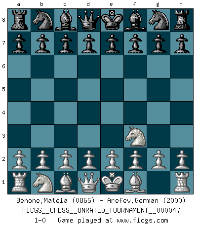 Last move : 1-0 2016 July 28 16:15:54 [Event "FICGS__CHESS__UNRATED_TOURNAMENT__000047"] [Site "FICGS"] [Date "2016.06.18"] [Round "1"] [White "Benone,Mateia"] [Black "Arefev,German"] [Result "1-0"] [WhiteElo "0865"] [BlackElo "2000"] 1.Nf3 1-0 This chess game has been lost on time (started : 2016.06.18 13:44:15) Reti Opening Player White won this chess game. Follow this game move after move (download)The passion for playing Chess is one of the most unaccountable in the world. (H.G. Wells) Dieses schreckliche Gefühl, dass ich gegen eine Maschine spielte, die niemals Fehler macht, zerschmetterte meinen Widerstand. (Mark Taimanov) Fischer era un maestro de claridad y un Rey del posicionamiento astuto. Sus oponentes podían ver hacia donde se dirigía pero eran impotentes para detenerlo. (Bruce Pandolfini) Celui qui prend des risques peut perdre, celui qui n'en prend pas perd toujours. (Xavier Tartacover) A cynic is a man who knows the price of everything but the value of nothing. (Oscar Wilde)