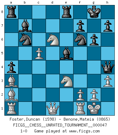 Last move : 1-0 2016 August 14 9:46:12 [Event "FICGS__CHESS__UNRATED_TOURNAMENT__000047"] [Site "FICGS"] [Date "2016.06.18"] [Round "1"] [White "Foster,Duncan"] [Black "Benone,Mateia"] [Result "1-0"] [WhiteElo "1598"] [BlackElo "0865"] 1.e4 c5 2.a3 g6 3.b4 Bg7 4.Nc3 cxb4 5.axb4 d5 6.exd5 Nf6 7.Bc4 O-O 8.Nge2 Nbd7 9.Bb3 b5 10.O-O Bb7 11.Nxb5 Nxd5 12.d4 Nxb4 13.c3 a6 14.Na3 Nd5 15.Nc2 a5 16.c4 N5b6 17.Ba3 Re8 18.Ne3 a4 19.Ba2 e5 20.c5 exd4 21.Nxd4 Qh4 22.Nb5 Be5 23.h3 Nf6 24.Nd6 1-0 Sicilian defense Kingside Castling by player Black (move 7) Kingside Castling by player White (move 10) Player White won this chess game. Follow this game move after move (download)Fischer is an American Chess tragedy on par with Morphy and Pillsbury. (Mig Greengard) Oft bringt ein stiller Zug das Erdbeben. (Richard Reti) Dios mío, Bobby Fischer juega tan simple. (Alexei Suetin) C'est la seule position que je connaisse où les deux camps sont mals. Propos prêtés à V. Anand. The production of too many useful things results in too many useless people. (Karl Marx)