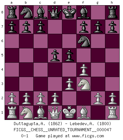 Last move : 0-1 2016 July 5 20:57:13 [Event "FICGS__CHESS__UNRATED_TOURNAMENT__000047"] [Site "FICGS"] [Date "2016.06.18"] [Round "1"] [White "Duttagupta,Aniruddha"] [Black "Lebedev,Alexandr"] [Result "0-1"] [WhiteElo "1862"] [BlackElo "1800"] 1.f4 d5 2.Nf3 Nf6 3.e3 e5 0-1 Bird's Opening Player Black won this chess game. Follow this game move after move (download)A bad day of Chess is better than any good day at work. (Anonymous) Wenn du nicht weißt was du tun sollst, warte bis dein Gegner eine Idee hat. Sie wird sicher schlecht sein. (Siegbert Tarrasch) Los Peones son nacidos libres, y aún así, se encuentran por doquier encadenados. (Rick Kennedy) Les échecs, c'est la lutte contre l'erreur. (Johannes Zukertort) I couldn't make any sense out of what this particular thread is about. It sounds like R2 D2 computer speaking. A space fight ?!? Some 'command' problems in Moscow ? Some killers & narcotic addicts attacking some game & a god wannabe ?? (Dinesh De Silva, lost in a russian conflict in FICGS forum)