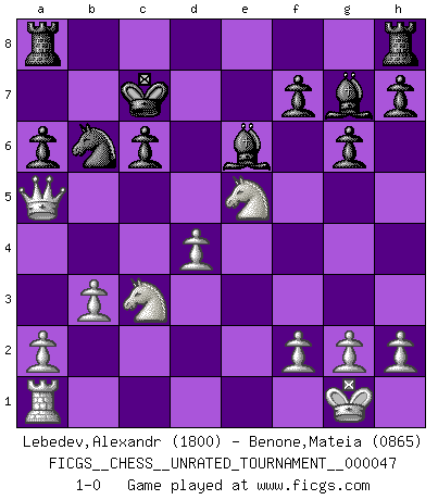Last move : 1-0 2016 October 10 8:9:11 [Event "FICGS__CHESS__UNRATED_TOURNAMENT__000047"] [Site "FICGS"] [Date "2016.06.18"] [Round "1"] [White "Lebedev,Alexandr"] [Black "Benone,Mateia"] [Result "1-0"] [WhiteElo "1800"] [BlackElo "0865"] 1.e4 c5 2.d4 cxd4 3.c3 Nf6 4.e5 Nd5 5.Nf3 Nc6 6.cxd4 d6 7.Bc4 Nb6 8.Bb5 a6 9.Bxc6+ bxc6 10.O-O g6 11.Re1 Bg7 12.exd6 Qxd6 13.b3 Bg4 14.Ba3 Qd7 15.Rxe7+ Qxe7 16.Bxe7 Kxe7 17.Qe1+ Kd8 18.Ne5 Be6 19.Qa5 Kc7 20.Nc3 1-0 Sicilian : Smith-Morra gambit Kingside Castling by player White (move 10) Player White won this chess game. Follow this game move after move (download)Via the squares on the chessboard, the Indians explain the movement of time and the age, the higher influences which control the world and the ties which link Chess with the human soul. (Al-Masudi) Charakterschwächen offenbaren sich normalerweise während einer Schachpartie. (Garry Kasparov) Me siento como si fuera una pieza en una partida de Ajedrez, cuando mi oponente me indica: esa pieza no puede ser movida. (Soren Kierkegaard) Le génie consiste à savoir transgresser les règles au moment opportun. (Teichmann) The arrogant army will lose certainly the battle. (Chinese proverb)